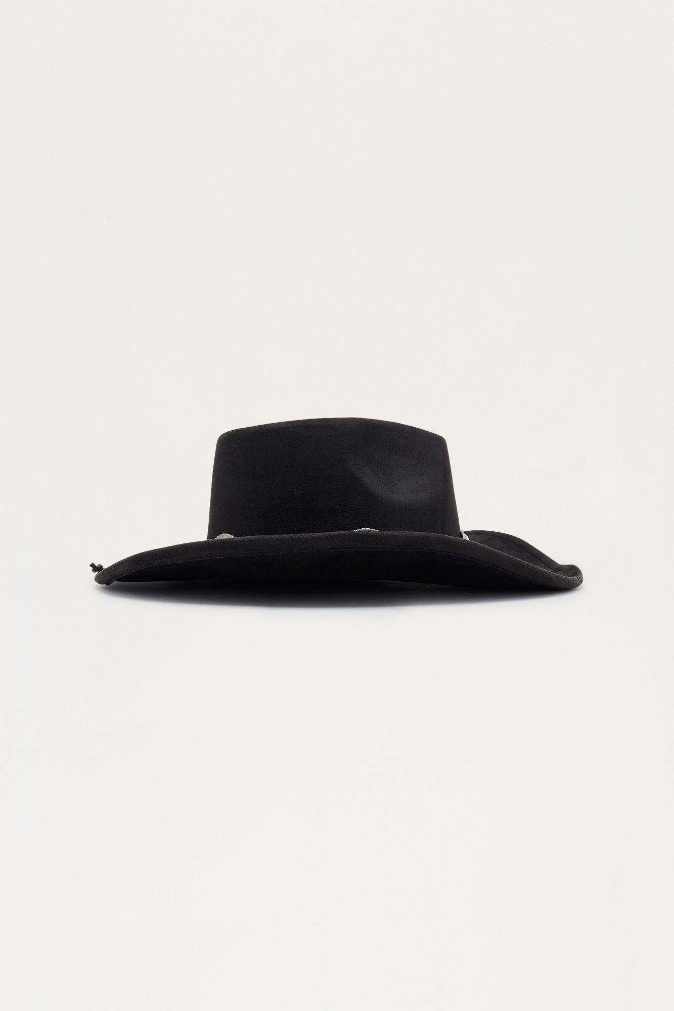 Available In Black. Faux Suede Cowboy Hat Hardware Trim Self : 100% Polyester Imported California Proposition 65WARNING: Cancer and Reproductive Harm - www.P65Warnings.ca.gov.