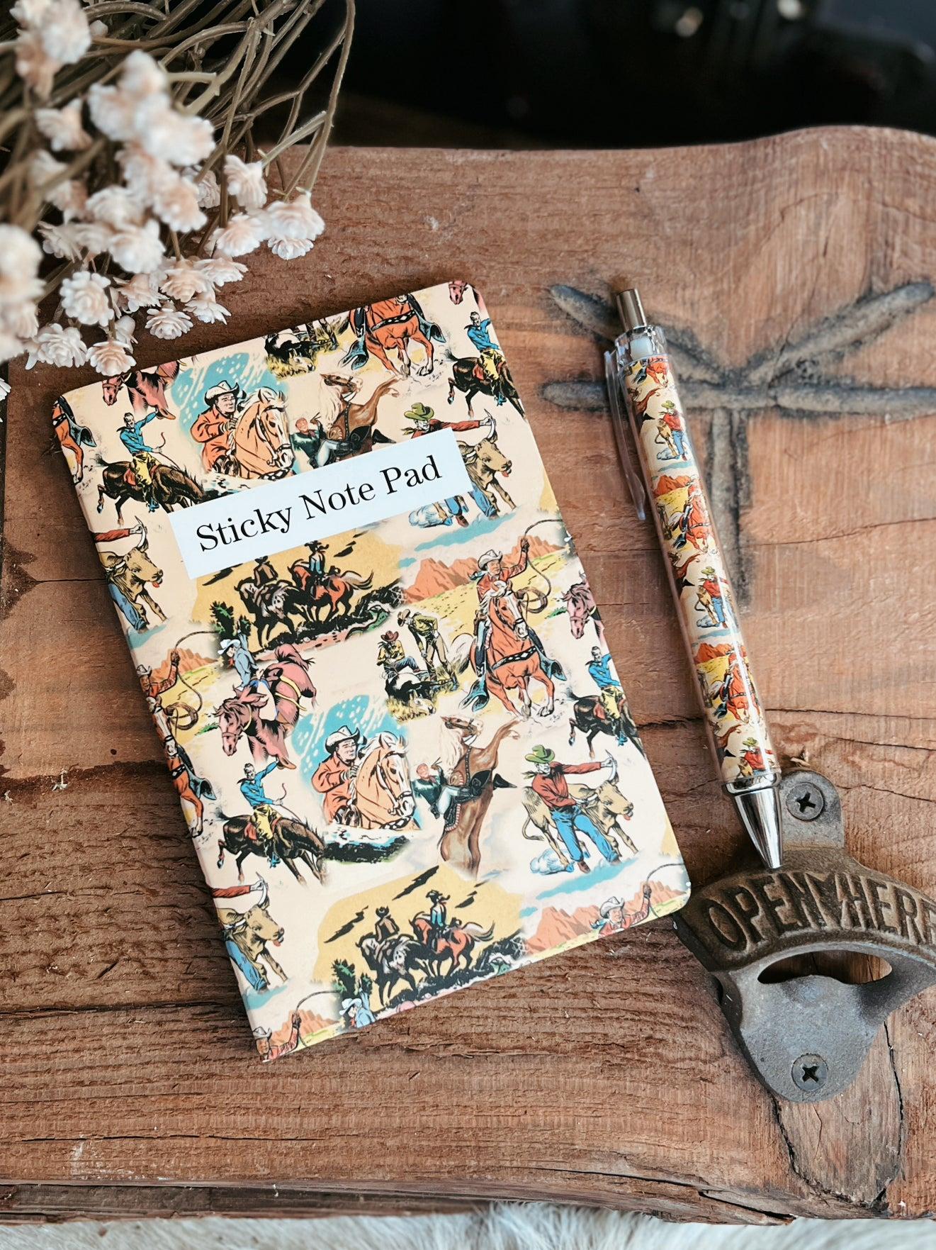 Western Style Sticky Note Pad And Pen Set - 4 Designs | Gussied Up Online Boutique Elevate your stationery game with our Western Style Sticky Note Pad and Pen Set! Organize your notes with 3 different sizes of sticky pads, including a fun disco ball and cactus design. Complete the set with a matching ballpoint pen. Perfect for stocking stuffers or gifts for boss babes. Get yours now! 6" X 4"
