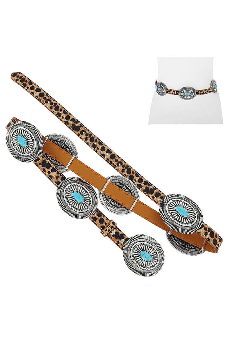 WESTERN PU LEATHER SYNTHETIC SEMI STONE TURQUOISE SUNBURST CONCHO BELT. LENGTH: 42" BUCKLES WIDTH: 2.25" ONE SIZE