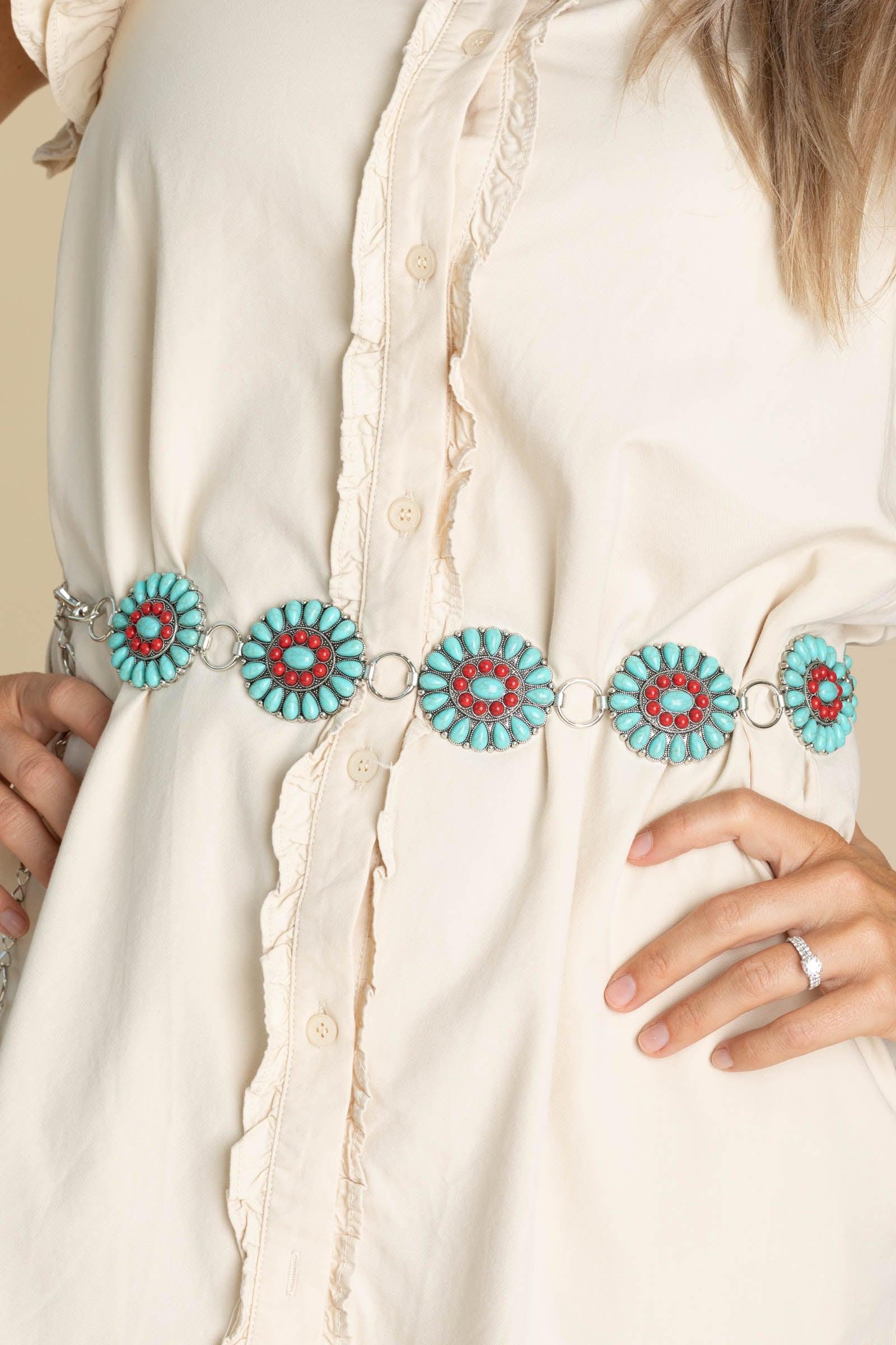 Product Details Color: Gold, Turquoise, Red/ Silver, Turquoise, Red Other Details: Lobster Claw Closure Vintage Western Chain Belt This chain belt showcases a unique western turquoise concho disc style. Witness the transformative power of accessories as this piece effortlessly redefines your fashion narrative. Material and Care 100% Alloy Size and Fit Length: 24 INCHES Extension: 19 INCHES