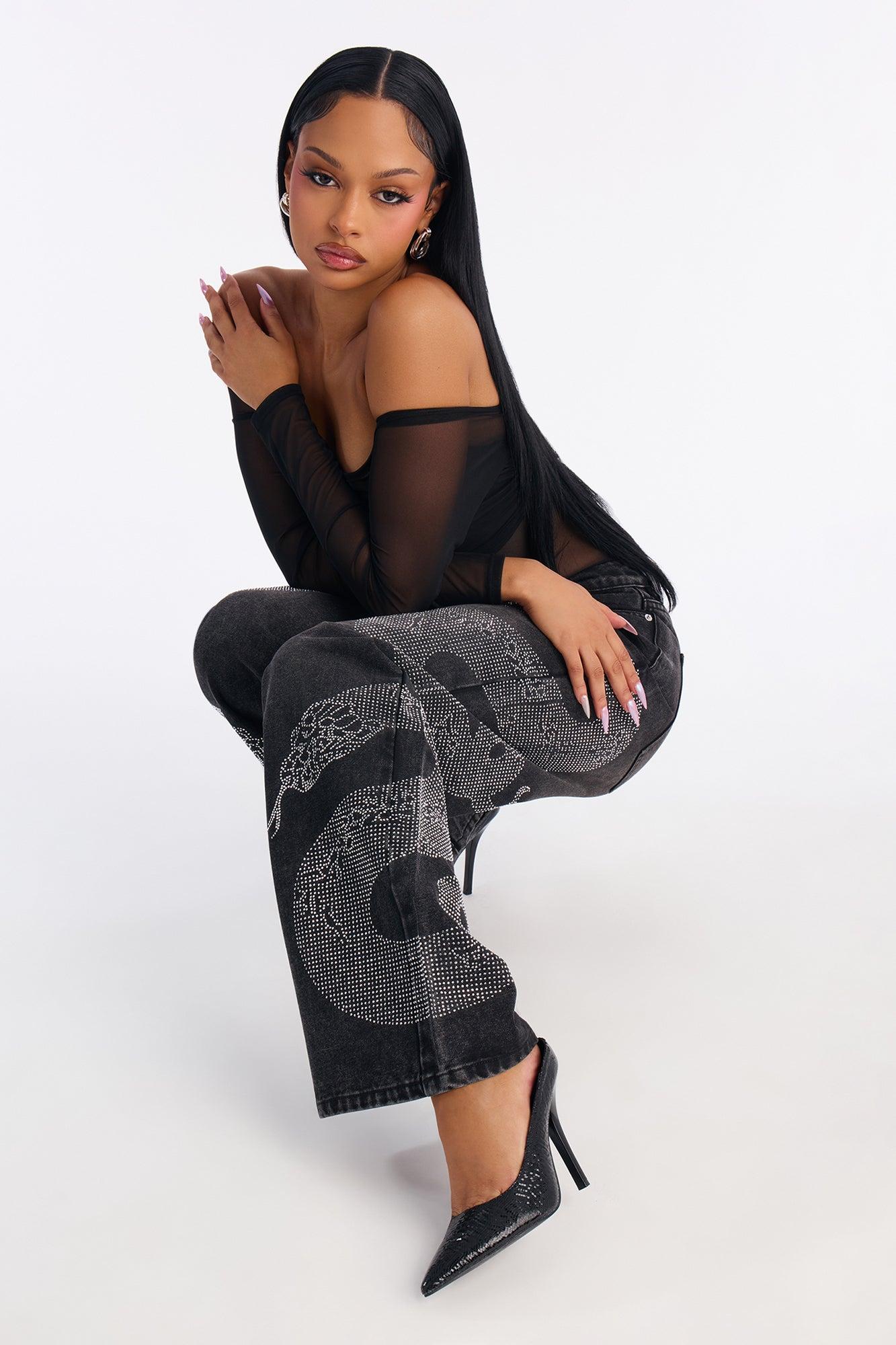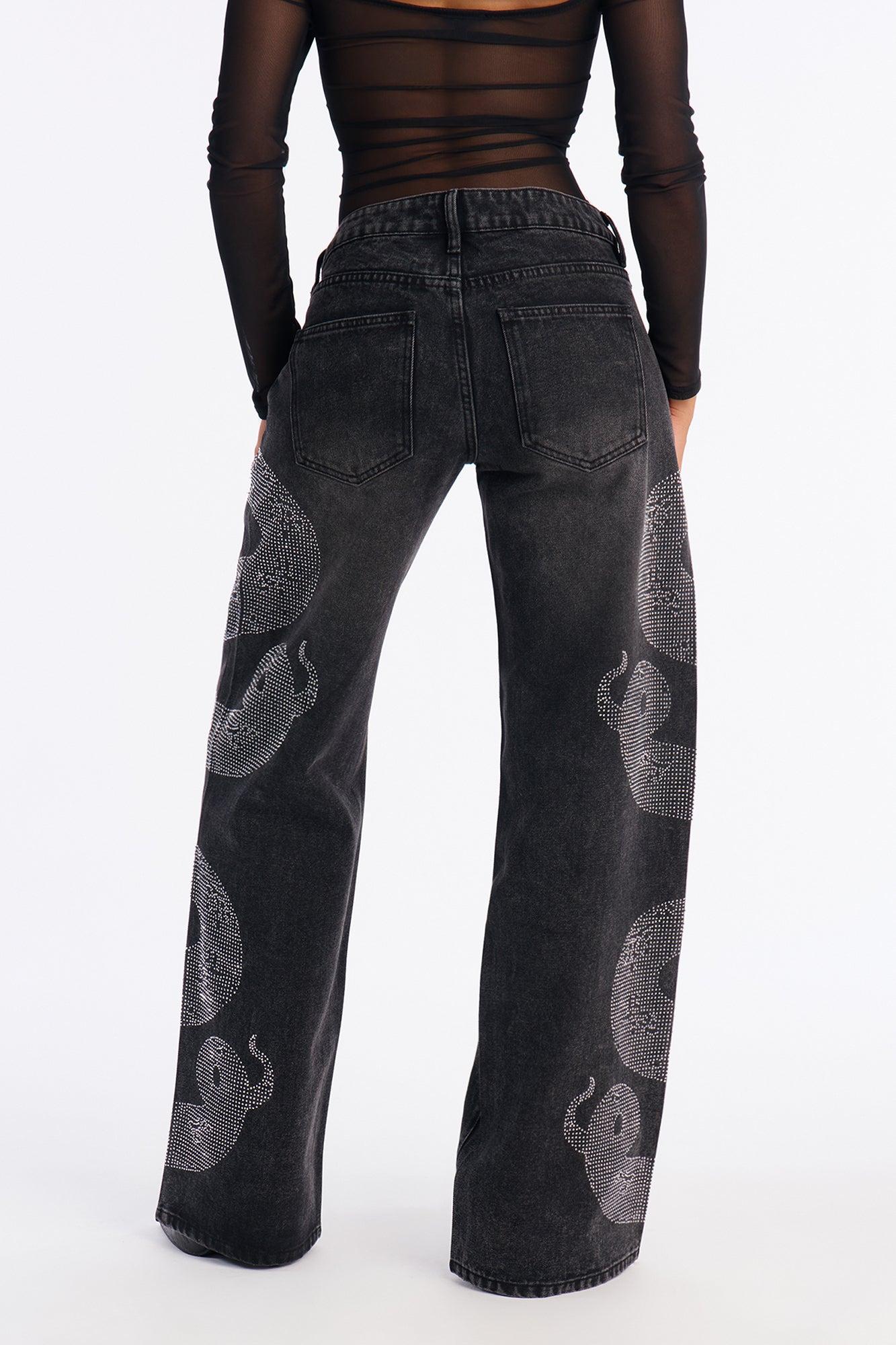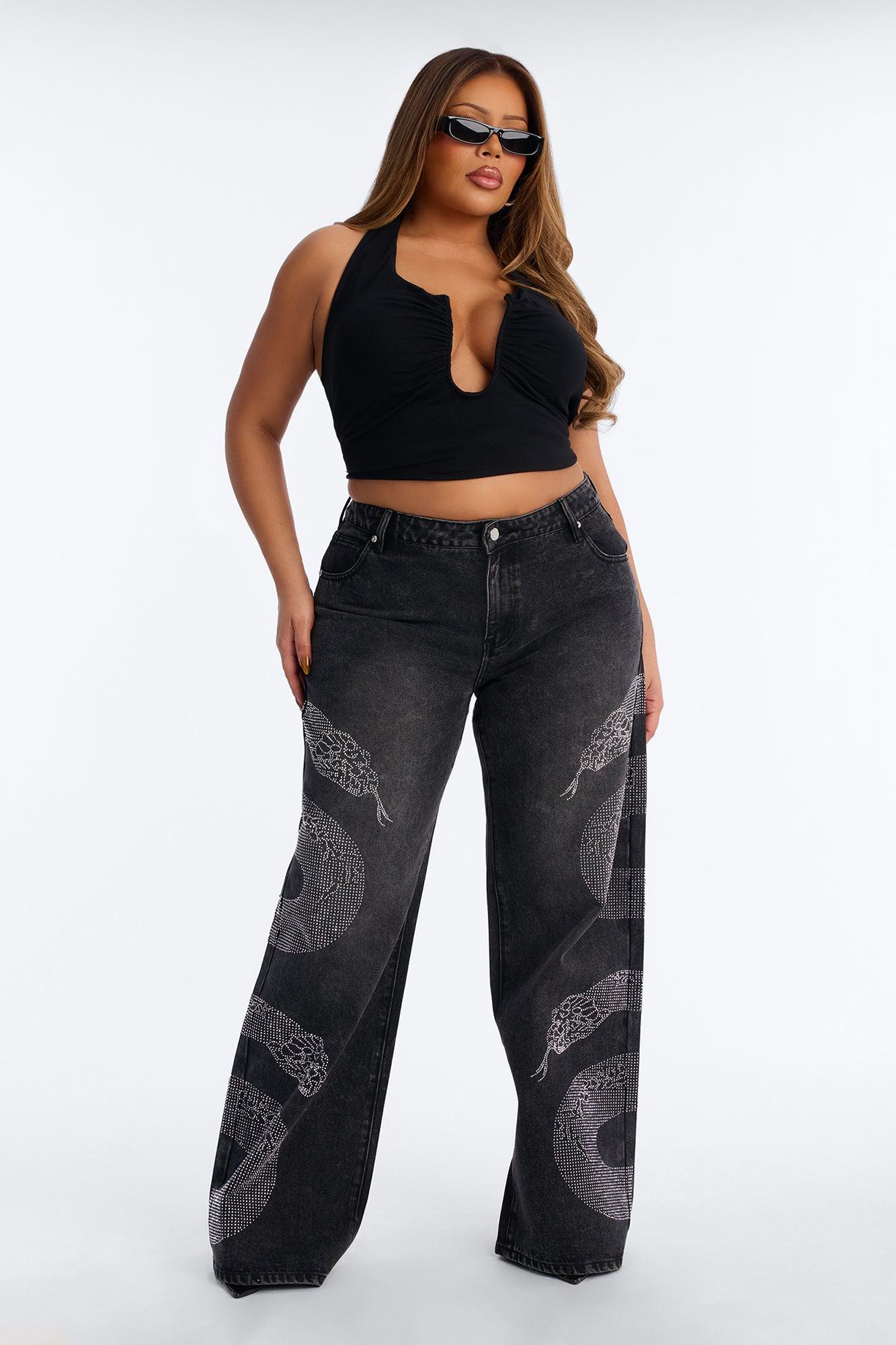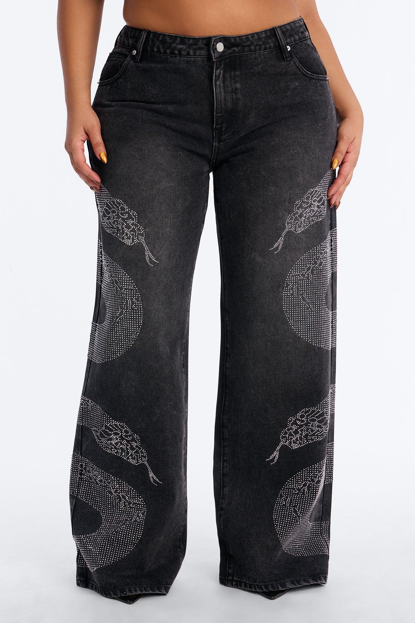 Available In Black Wash. Wide Leg Jean 5 Pocket Snake Embellishment 11" Rise 33" Inseam Non-Stretch Disclaimer: Due To The Specialized Wash, Each Garment Is Unique. 100% Cotton Imported California Proposition 65WARNING: Cancer and Reproductive Harm - www.P65Warnings.ca.gov.
