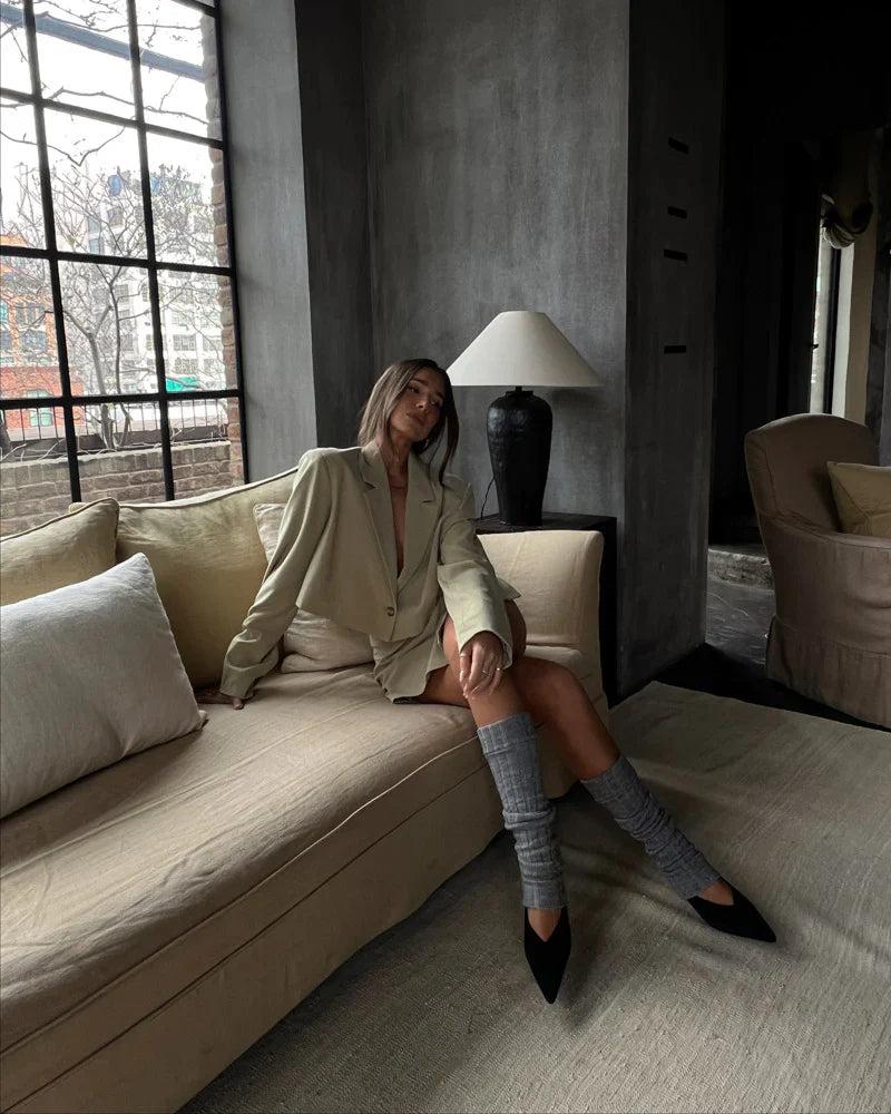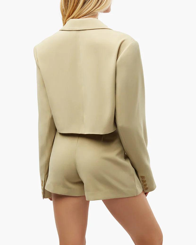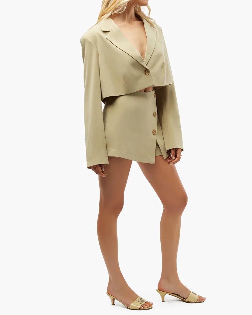 The Boxy Cropped Suiting Blazer is styled with the Faux Wrap Mini Suiting Skirt