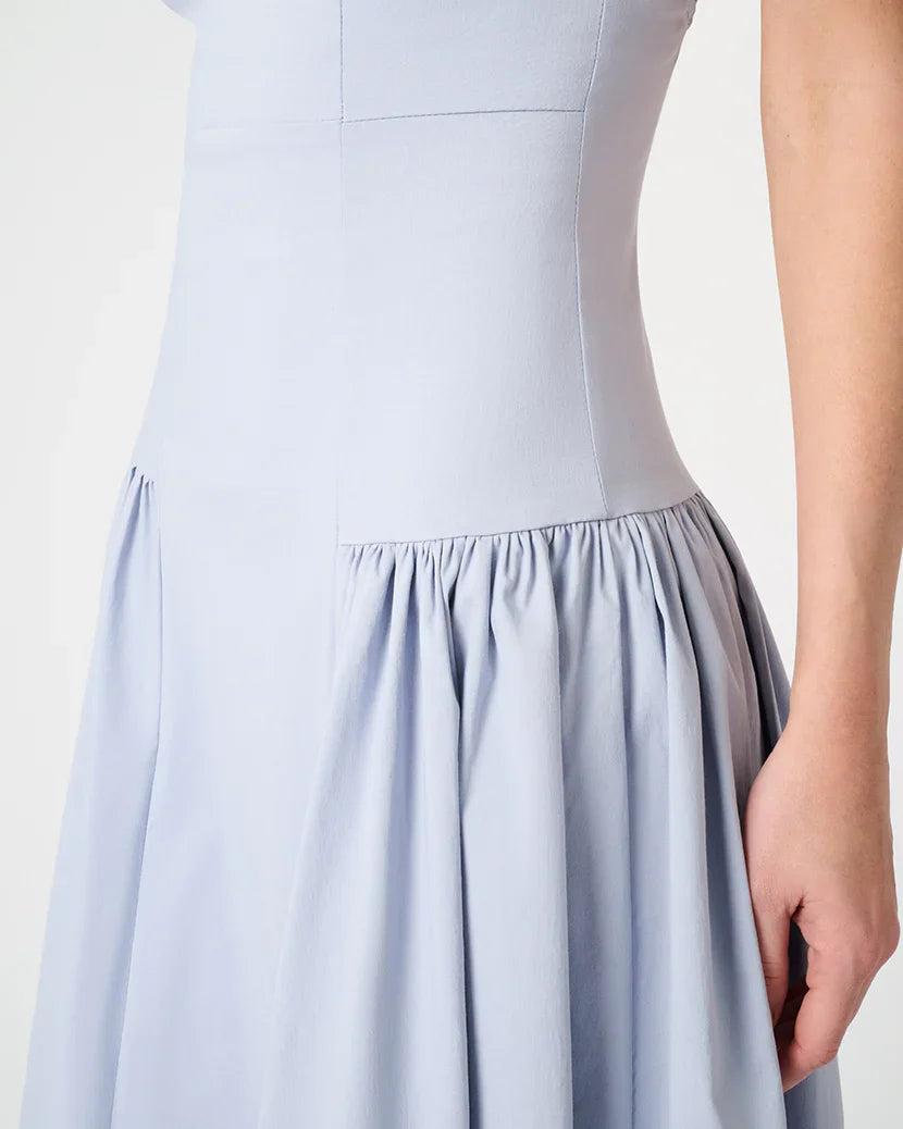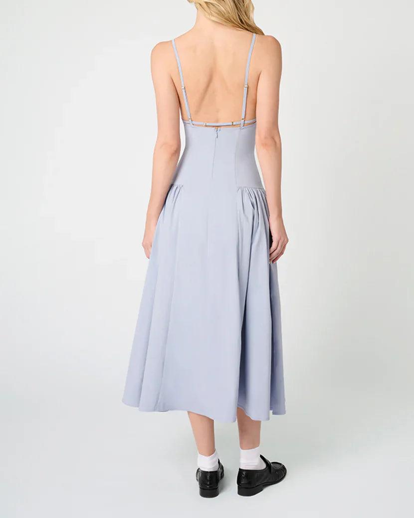 This midi dress has a high neckline, princess seams and shirring on panels at either side of the full skirt. It comes in stretch fabric with adjustable shoulder straps and an open back with an invisible zipper closure.