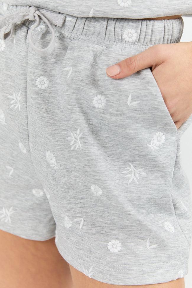 Details Gray lounge shorts Fabric has stretch Elastic waistband with drawstring, pockets, embroidered floral details Unlined Size small inseam: 2" Material and Care 49% polyester, 45% rayon, 6% spandex Hand wash cold, dry flat Patterns may vary Materials may have natural variations Colors may vary from different viewing devices