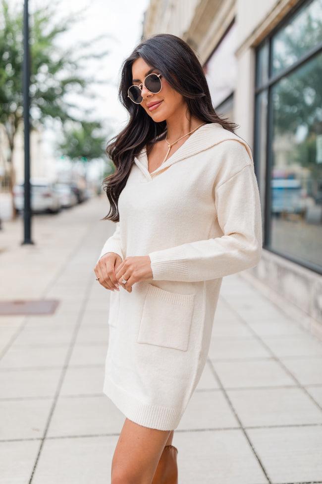 Details Ivory Collared Sweater Dress Fabric has stretch Collared style, functional pockets, long sleeves, ribbed hem Pair this dress with cute boots! Unlined Size small from shoulder to hem: 29" Material and Care 74% acrylic 22% polyester 4% nylon Hand wash cold, no drum drying Patterns may vary Materials may have natural variations Colors may vary from different viewing devices.
