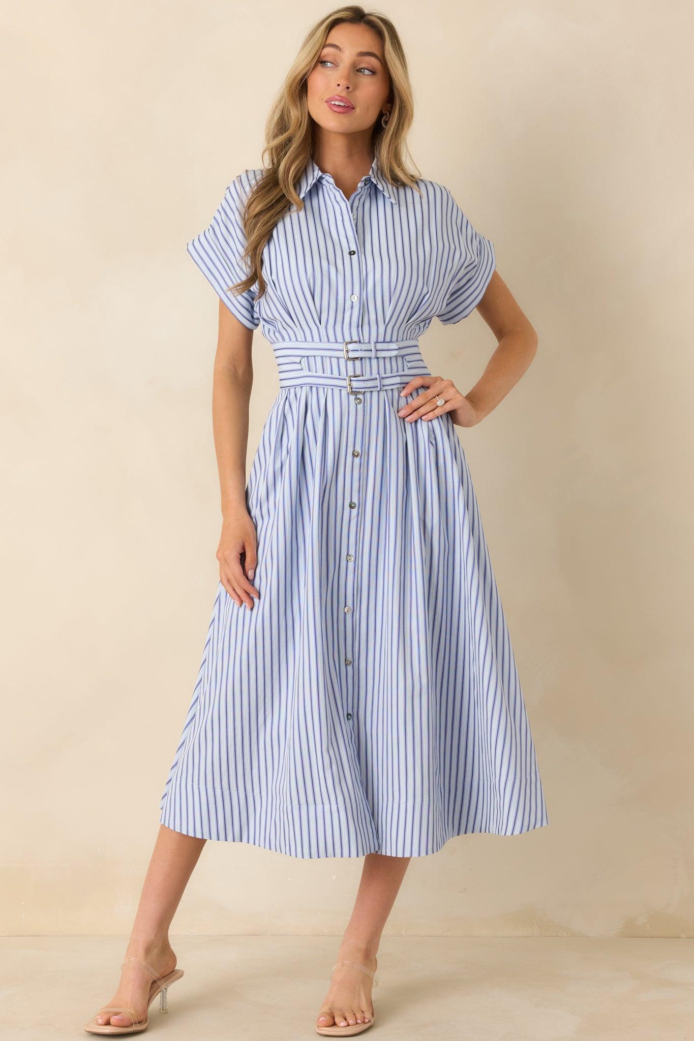 Easy to wear and full of promise, the What’s to Come Blue Stripe Belted Button Front Midi Dress feels like the start of something good. The tailored waist and classic button-front design give it a refined look, while the soft movement through the skirt keeps it approachable and effortless. It’s the kind of piece that works for today and feels just as right for whatever’s next. This blue midi dress features contrasting vertical striping in dark blue and light blue. Designed with a collared neckline and functional button-front closure, this style includes short cuffed sleeves and an attached front belt detail that is secured at the sides for a flattering, streamlined fit. Finished with side pockets and soft pleating through the skirt for ease and movement.63% Polyester & 35% Cotton LinedHand Wash Cold Manufactured in China Designed in The USA Model is 5'8" and Wearing a Size Small, Clipped, Model is a True X-Small
