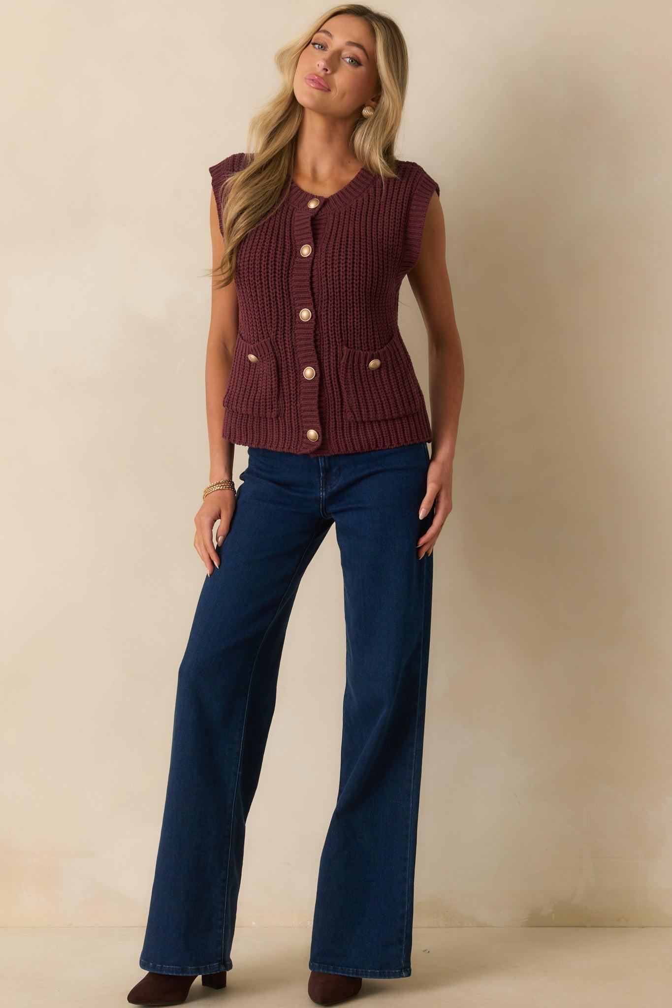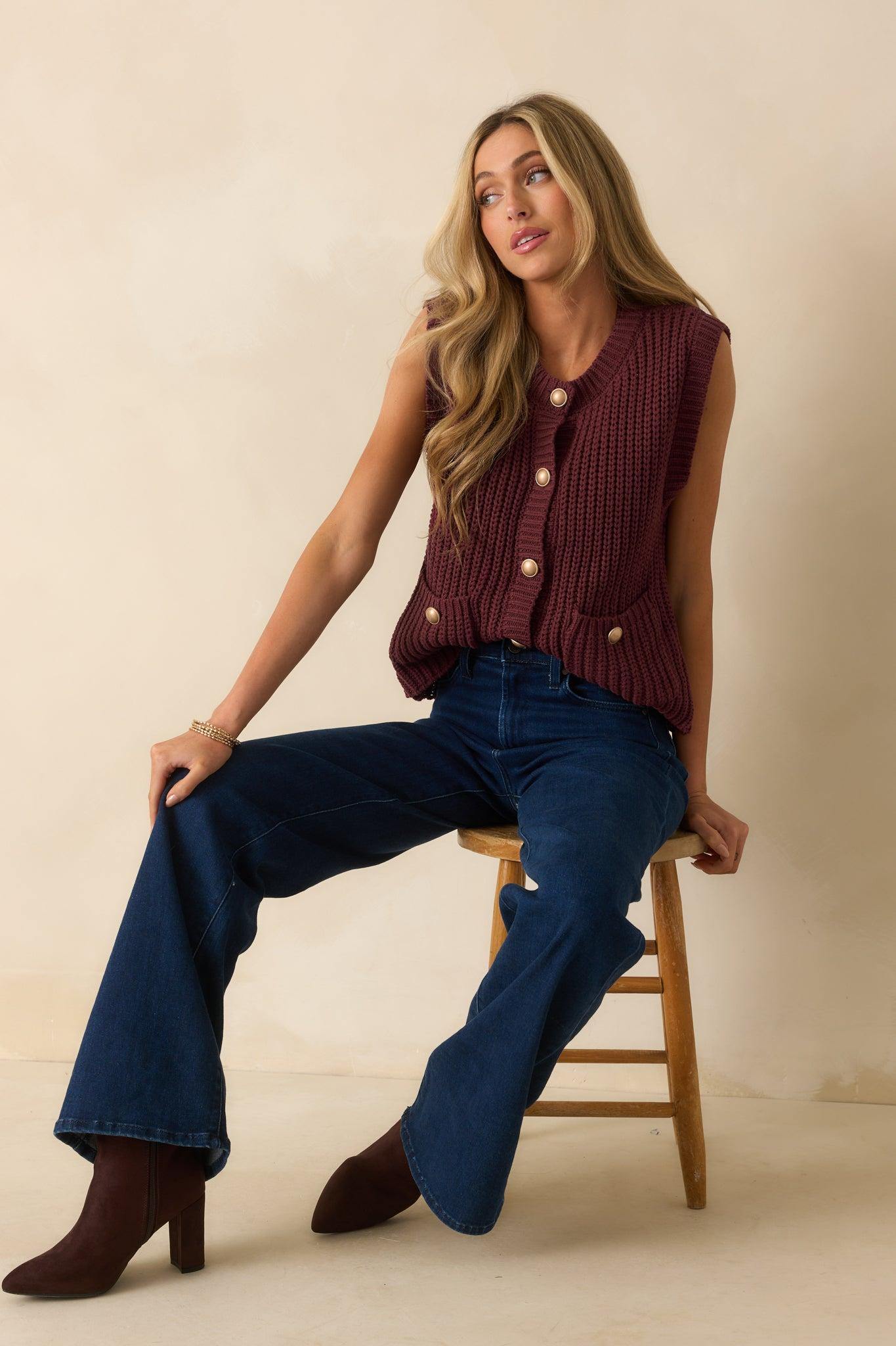 The What You Came For Wine Red Ribbed Knit Button Up Sweater Vest delivers exactly what you need, a bold layer that brings focus and style without the extra effort. This wine red sweater vest features a ribbed knit fabric, round neckline, functional button up front with gold-tone domed buttons, functional front patch pockets, ribbed hems, and a relaxed fit. 60% Cotton & 40% Acrylic Unlined Hand Wash Cold Manufactured in China Designed in the USA Model is 5'8" and wearing size small