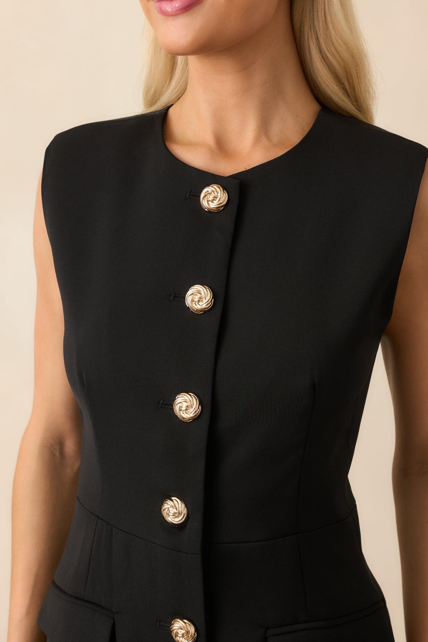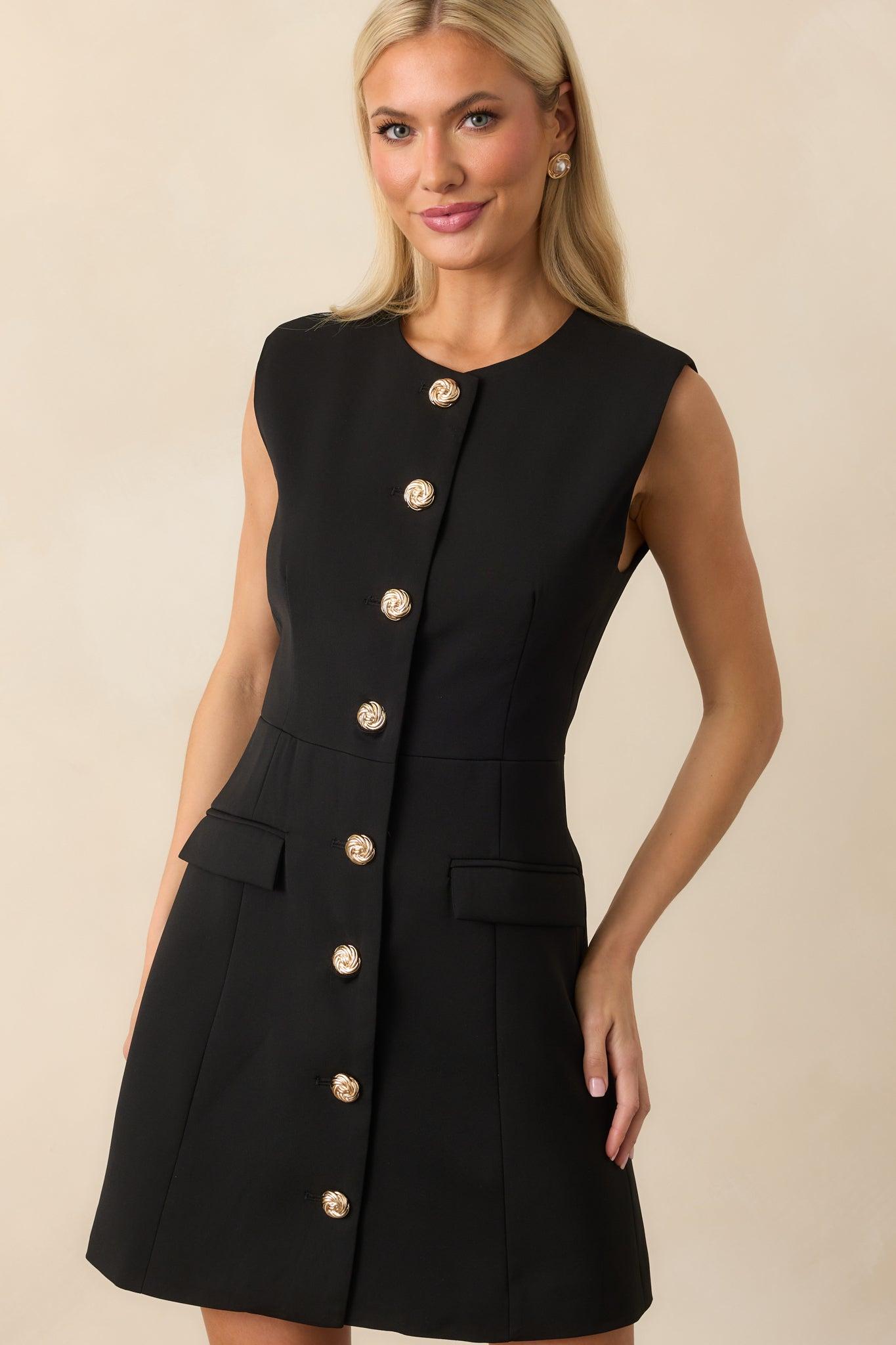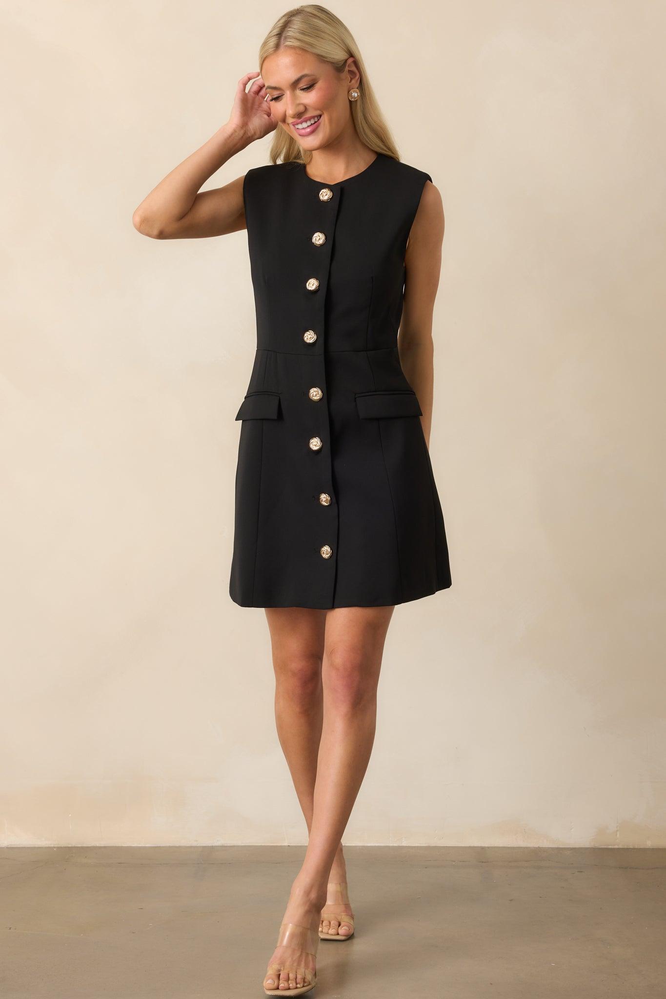 Whatever She Wants Black Sleeveless Tailored Mini Dress brings a polished edge to your wardrobe with its sleek silhouette and luxe details. Designed to command attention, this tailored mini dress features a structured fit that flatters your shape while maintaining timeless elegance. Whether you're headed to the office or a stylish evening out, this dress delivers confidence and sophistication in every step. This black mini dress features a functional gold button front closure, faux flap pockets, a high round neckline, sleeveless design, and tailored silhouette.