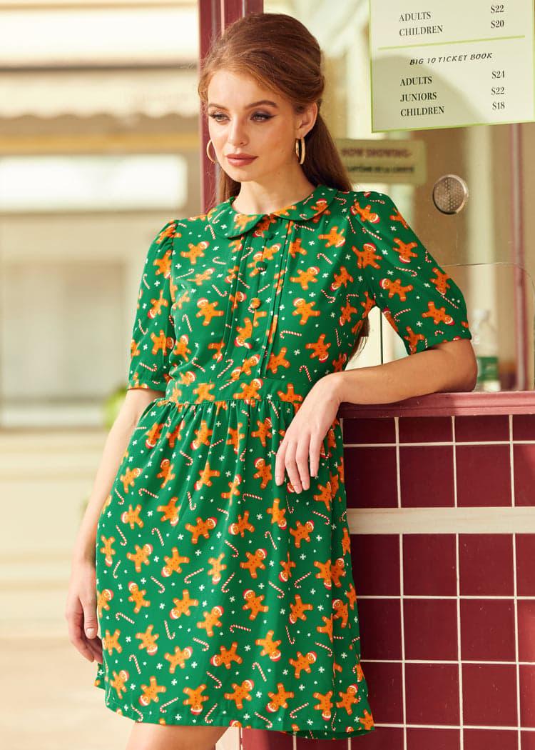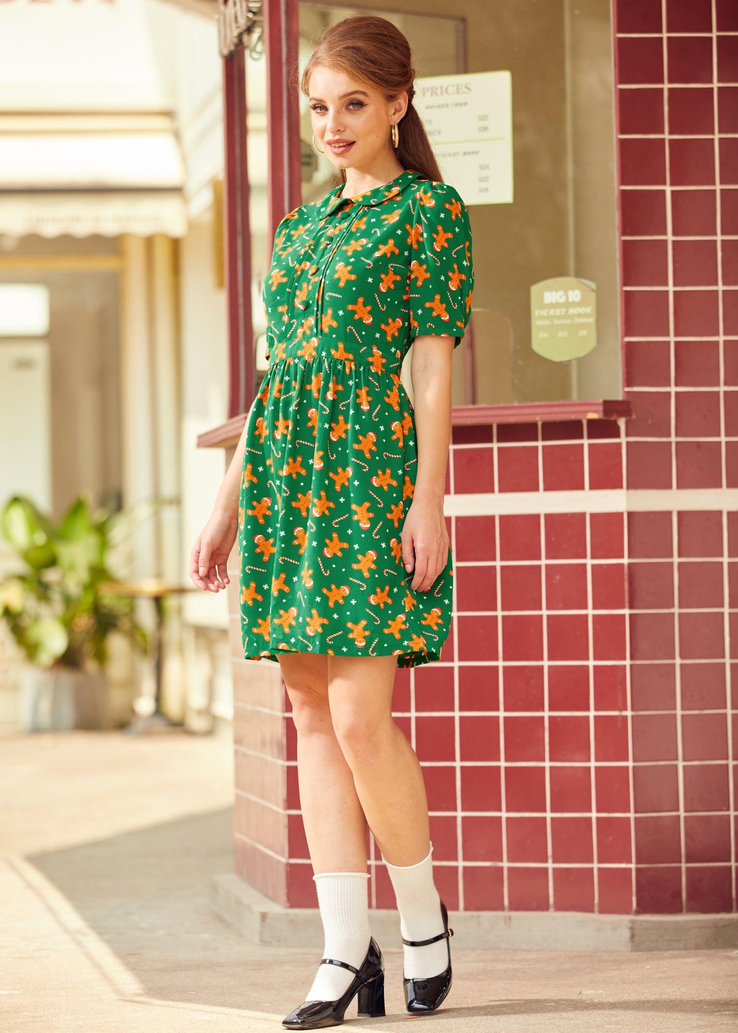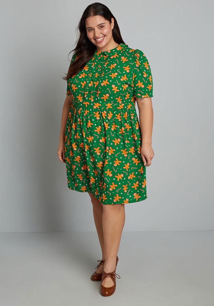 Let this whimsically festive, green dress from our ModCloth namesake label be the happy thought that makes your holiday spirits soar! Made from a lightweight woven fabric and boasting an exclusive hand-drawn print of gingerbread cookies playfully tumbling amidst candy canes and snowflakes, this retro-fab frock is an instant holiday classic! Featuring a darling Peter Pan collar, a placket of fabric-covered buttons at the front bodice accented by pintuck bib-front, short puff sleeves with buttons cuffs, and a gathered waist that adds just the right amount of fullness to the skirt, this fabulous A-line will be a favorite for many winter seasons to come.100% Recycled PolyesterMachine wash.Runs true to size. Fabric does not provide stretch.Unlined. Semi-sheer. Back zipper with hook and eye closure.Imported4=36 in. length16W=38 in. length