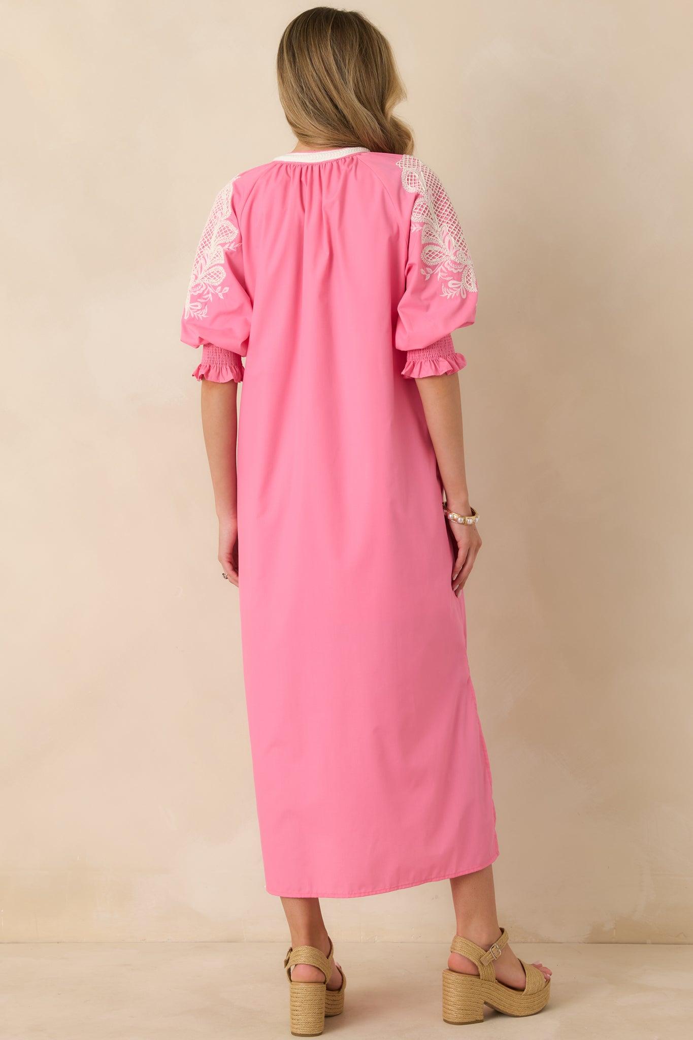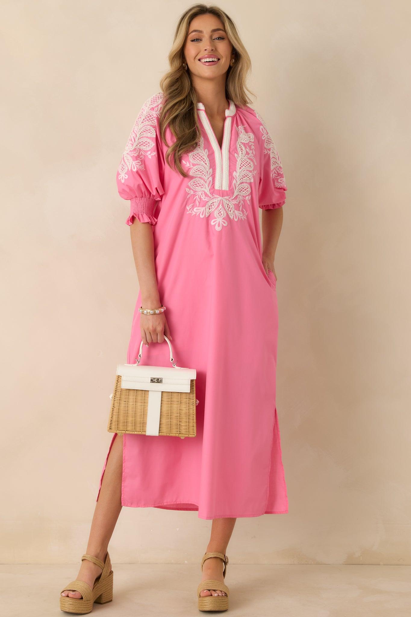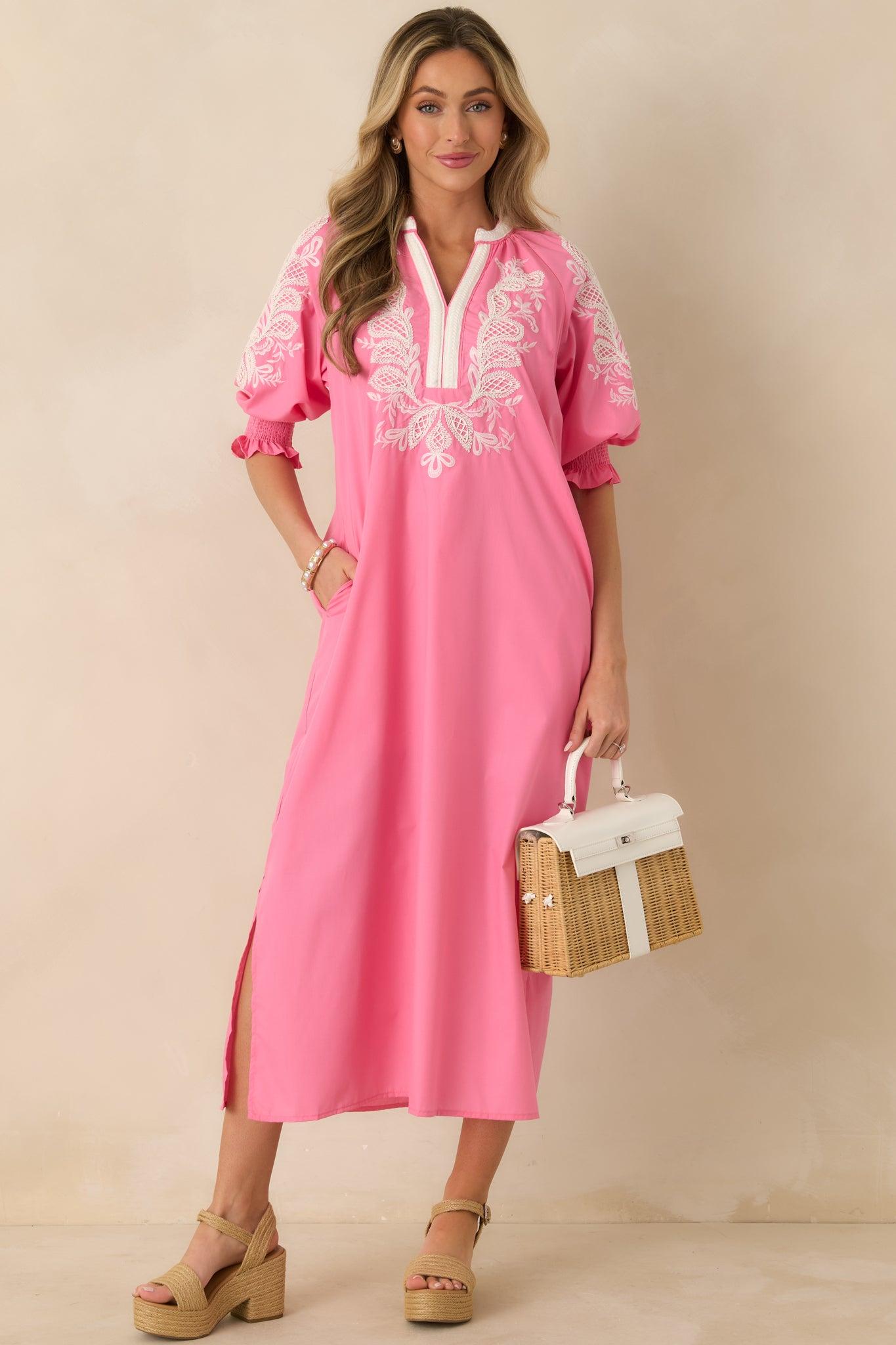 Soft, romantic, and effortlessly graceful, the When It Feels Right Pink Embroidered V-Neck Maxi Dress is made for those moments when you want to feel comfortable and beautifully put together. The flowing silhouette and delicate embroidery give it an easy elegance that works just as well for daytime gatherings as it does for sunset dinners. It’s the kind of dress you reach for when you want your outfit to feel natural, feminine, and just right. This pink maxi dress features a lightweight woven fabric with intricate white embroidered detailing across the bodice and sleeves. Designed with a split V-neckline and relaxed fit, it includes elbow-length puff sleeves with smocked cuffs. The flowing maxi-length skirt creates soft movement, while side pockets add a practical finish. 65% Polyester & 35% Cotton Lining: 100% Rayon Hand Wash Cold Manufactured in China Designed in the USA Model is 5'8" and wearing size small, clipped, model is a true x-small