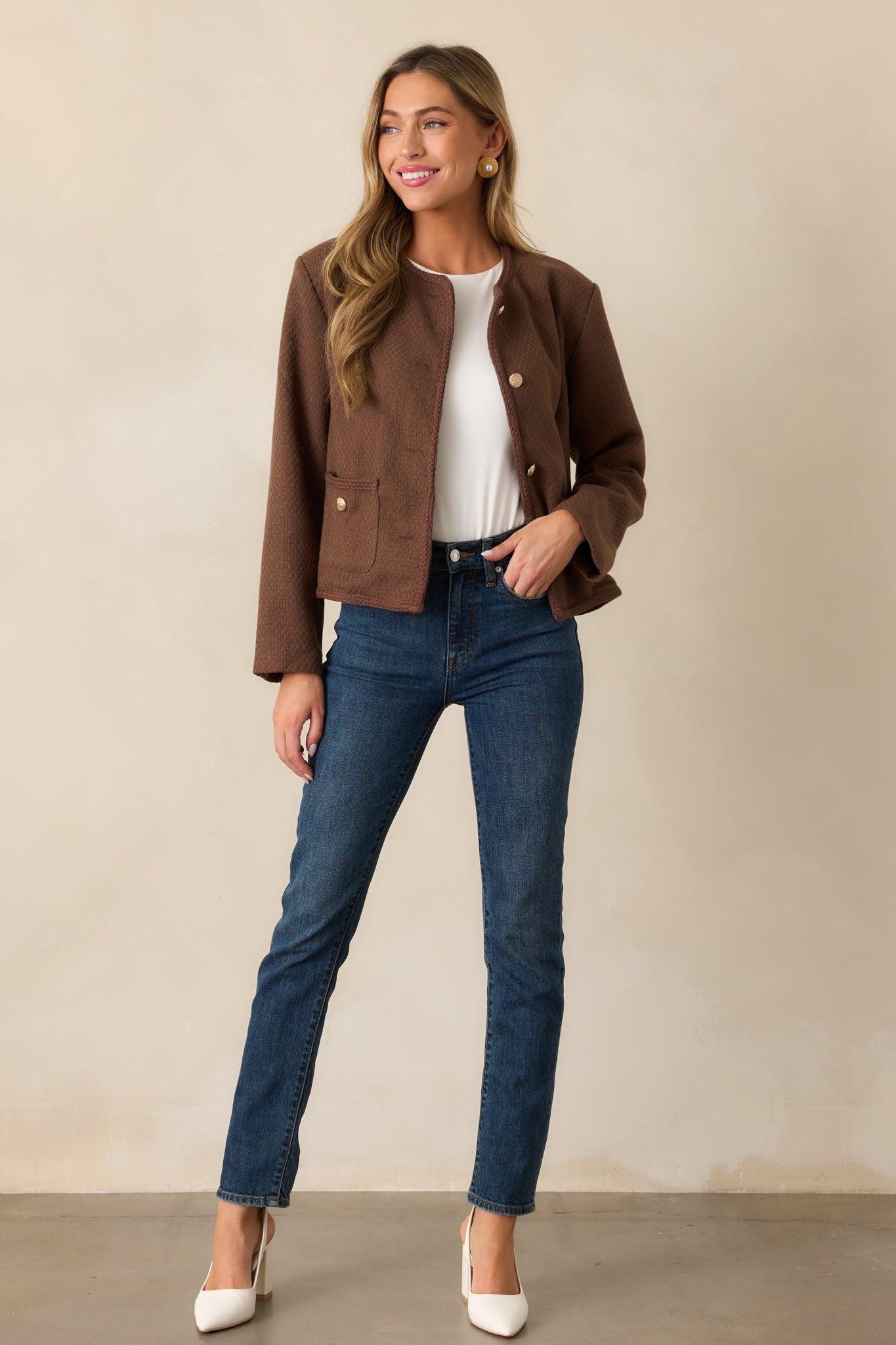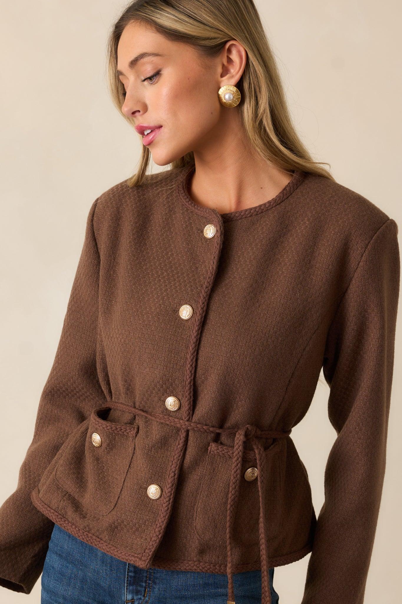 Introducing the When We Meet Chocolate Brown Jacket - the perfect blend of style and comfort. Made with high-quality materials, this jacket will keep you warm and looking stylish no matter where you go. Experience the joy of wearing a jacket that not only makes a statement, but also feels amazing! This chocolate brown jacket features a tailored design, a tweed style fabric, a round neckline, braided trim throughout, an optional self tie braided waist belt, a functional button front, and two functional waist pockets.