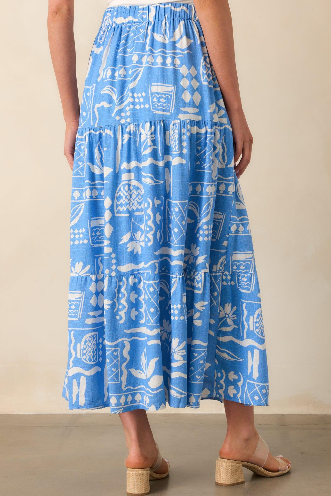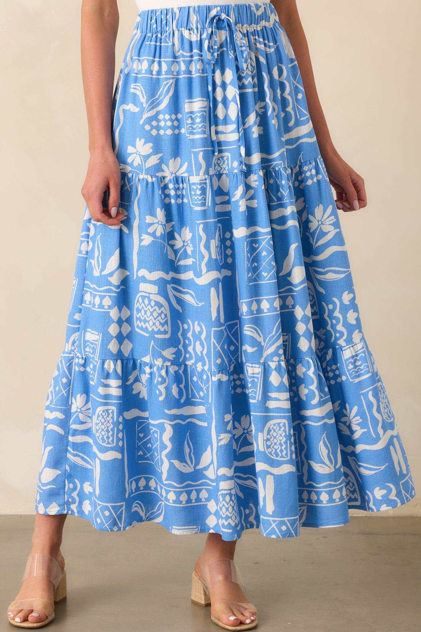 The Where The Good Energy Is Blue Tropical Print Rayon Maxi Skirt brings bold, feel-good vibes to any day. Whether you're heading somewhere special or just soaking up the moment, it’s the kind of piece that turns simple plans into something worth remembering. This blue maxi skirt features a white tropical print, an elastic waistband, decorative drawstring tie, tiered skirt design, lightweight rayon-linen blend fabric, and blue lining.