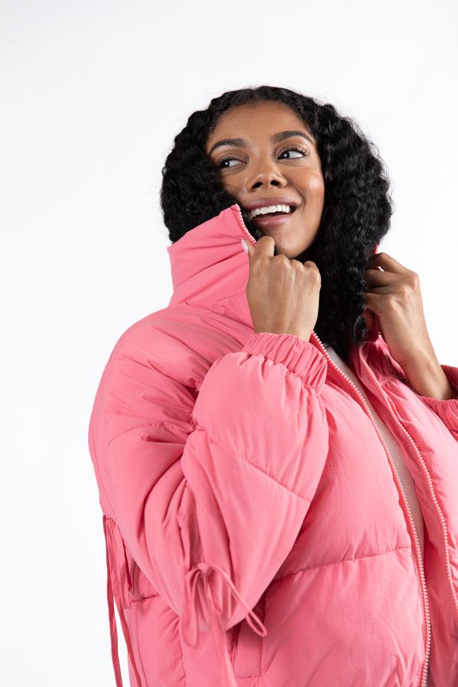 Details Pink Bow Sleeve Puffer Jacket Fabric has no stretch Collared style, functional pockets, drawstring bow sleeves, functional zipper closure Pair this jacket with a cute pair of jeans! Lined Size small from shoulder to hem: 19" Material and Care Self: 100% nylon, lining: 100% polyester Machine wash cold, line dry Patterns may vary Materials may have natural variations Colors may vary from different viewing devices.