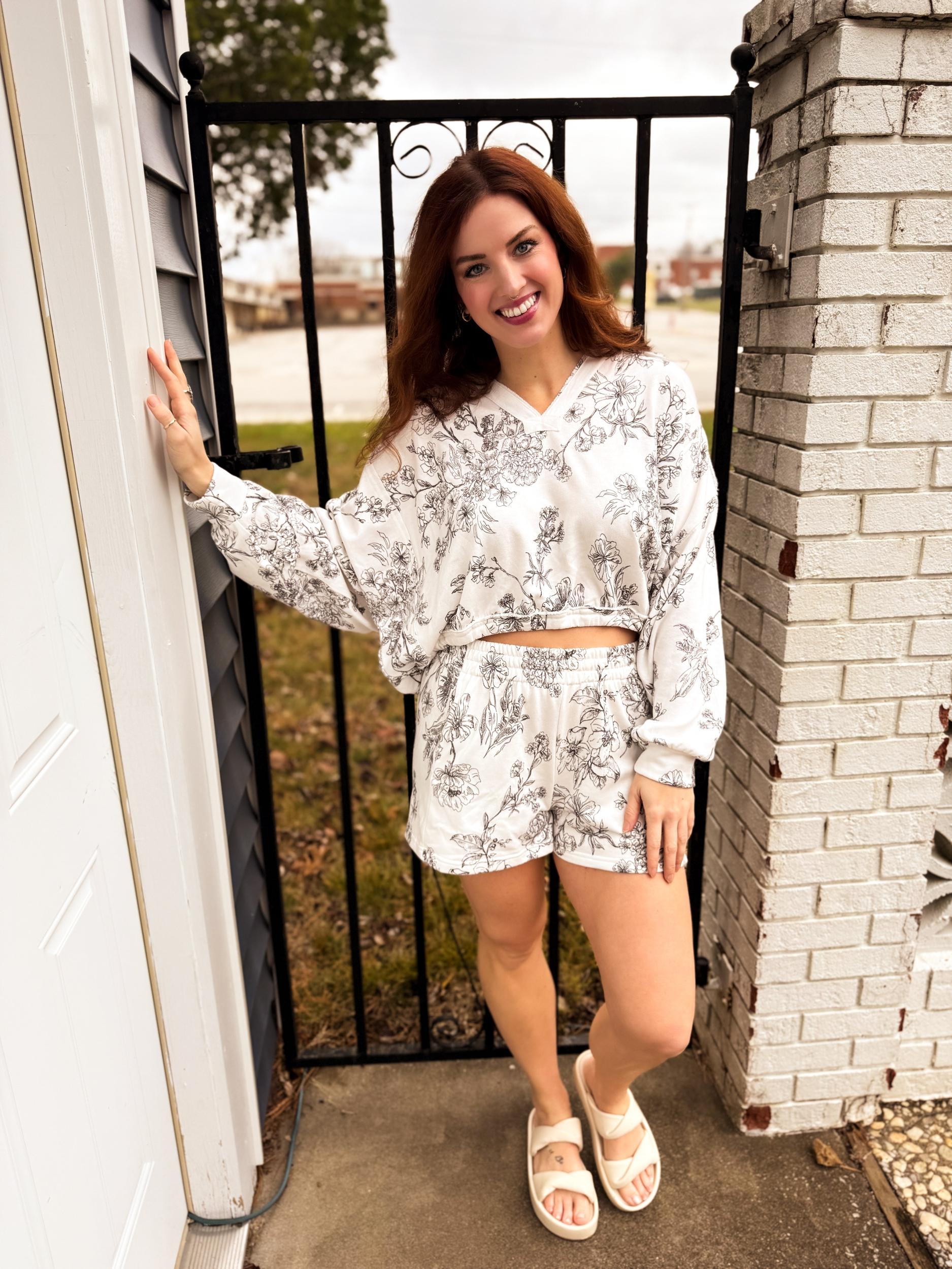 This Whimsical Alice French Terry Set is a match made in heaven - literally! The printed cotton terry fabric provides a unique and playful touch, while the elastic waistband and side pockets add convenience. The long sleeve cropped top with a collared neckline completes the fun and fashionable look.