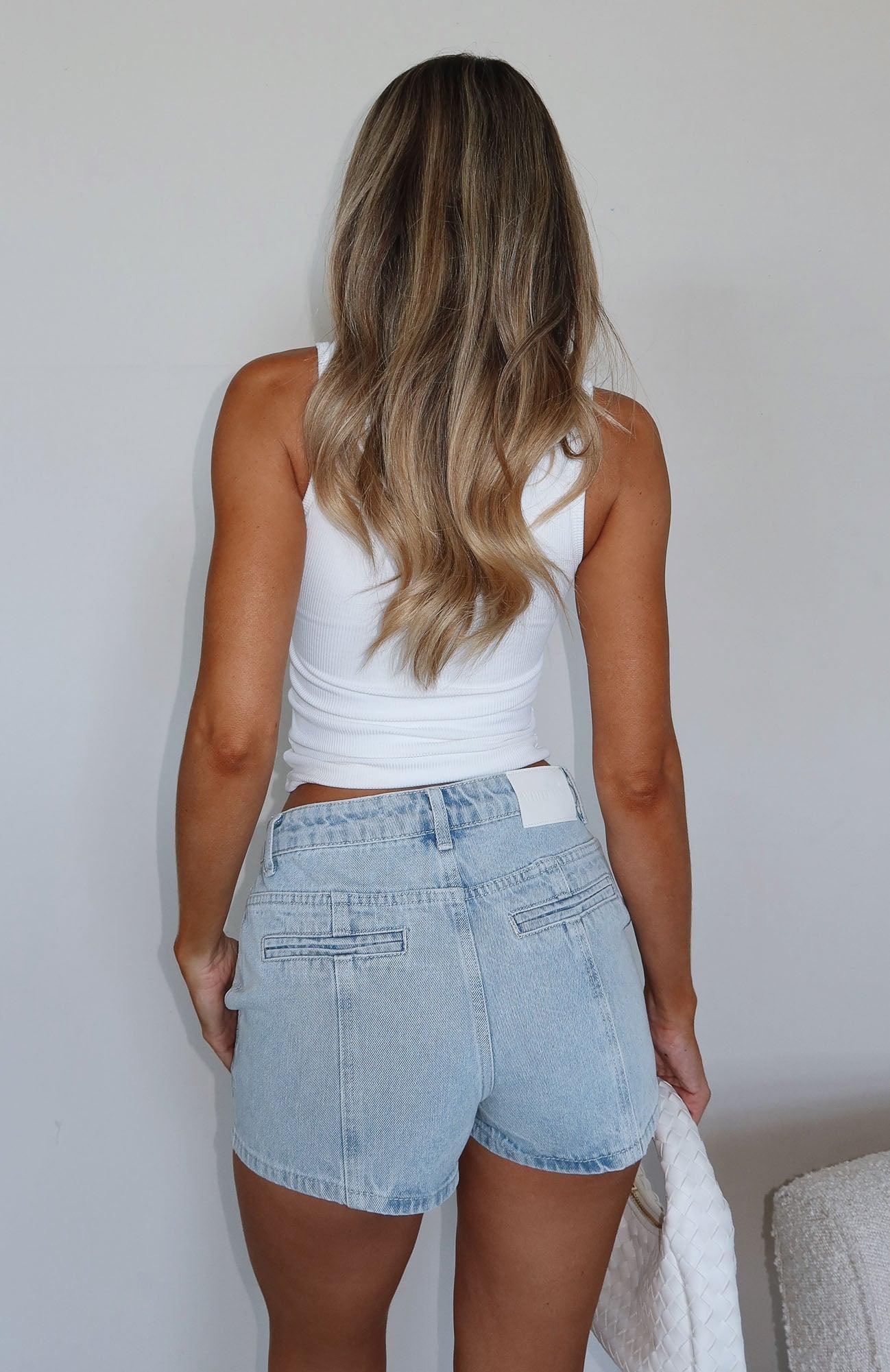 WHITE FOX DENIM Just a little outfit inspo. The Whispers Of Us Denim Shorts Glacier Blue features a zipper‑and‑button closure, belt loops, and functional side pockets for a clean, classic look. Faux back pockets and a subtle faux‑leather label add chic detailing. Style them with your go‑to tank, a pair of sandals and sunnies for an easy, summer‑ready outfit. Due to the nature of denim, washes will vary per individual garment. Colour fade/ transfer naturally occurs but will ease over time as the garment wears. We recommend washing your denim inside out, in cold water.