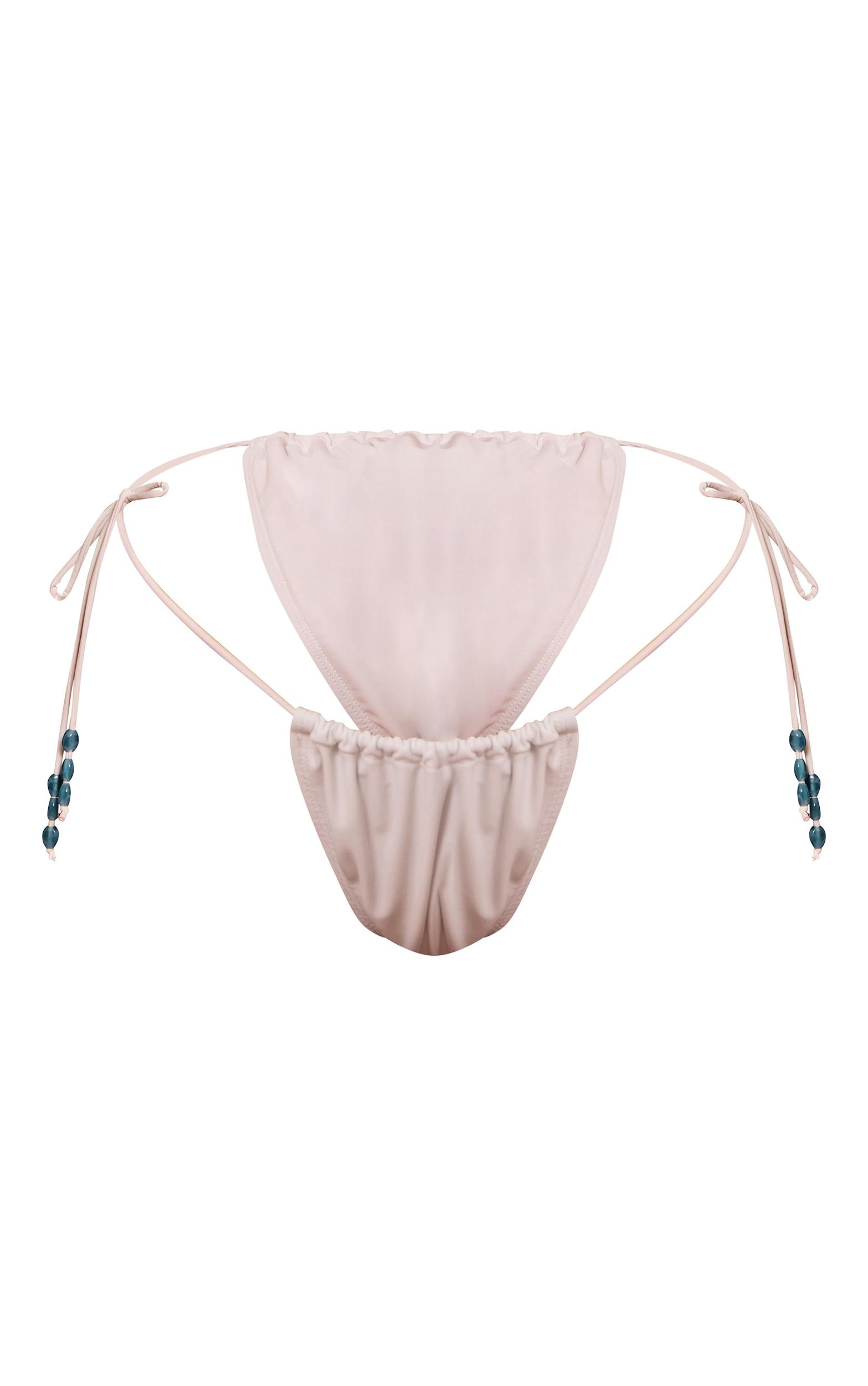 Bring a touch of knowing artistry to your swimwear collection. This white bead trim ruched tie side bikini bottom, presented in crisp white, is distinguished by its delicate tie sides, meticulously adorned with striking blue bead embellishments that catch the light. The artful ruching across the front panel ensures a precise fit, crafting a confident line perfect for every sun-soaked day by the water. Pair these elevated bottoms with their coordinating bikini top and a flowing, unbuttoned linen shirt for a self-aware resort aesthetic that effortlessly takes center stage.Length approx 29cm/11.5inch (Based on sample size US 4)Model wears size UK 8/ EU 36/ AUS 8/ US 4Model Height - 5ft 6inchp]:!mb-4inch>Category: SwimwearProduct type: Tanga Bikini BottomColor: WhiteMaterial: SwimDesign: PlainOccasion: Day