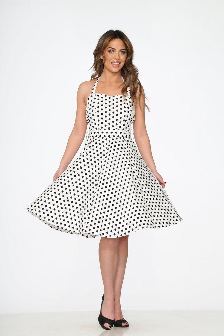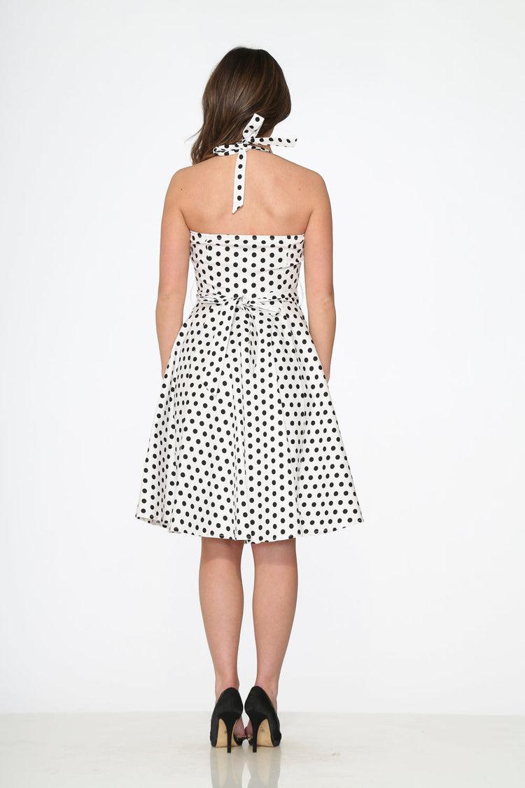 Step into a retro daydream with the Orchid Bloom White & Black Polka Dot Halter Dress. Featuring a playful pin-up silhouette, this dotted darling channels classic 1950s vibes with a flattering halter neckline, nipped waist, and full swing skirt. It’s the kind of dress that practically begs for a twirl—and maybe a cherry-topped milkshake too. 97% Cotton, 3% Spandex – fabric provides stretchSide zipper closureLength: 41"ImportedMachine wash cold, tumble dry low or hang to air-dry