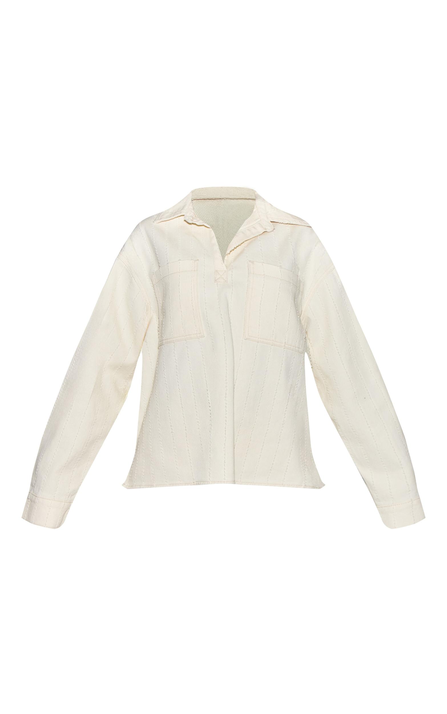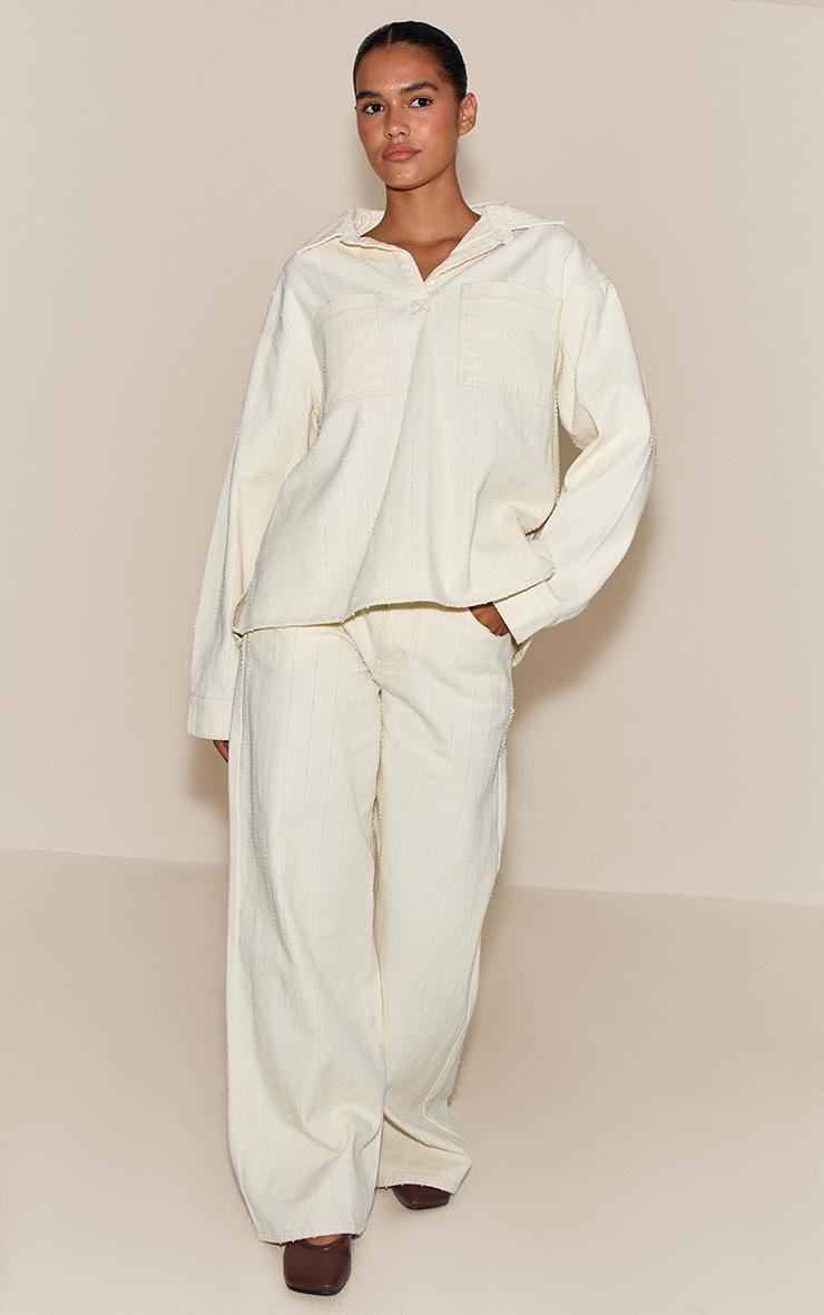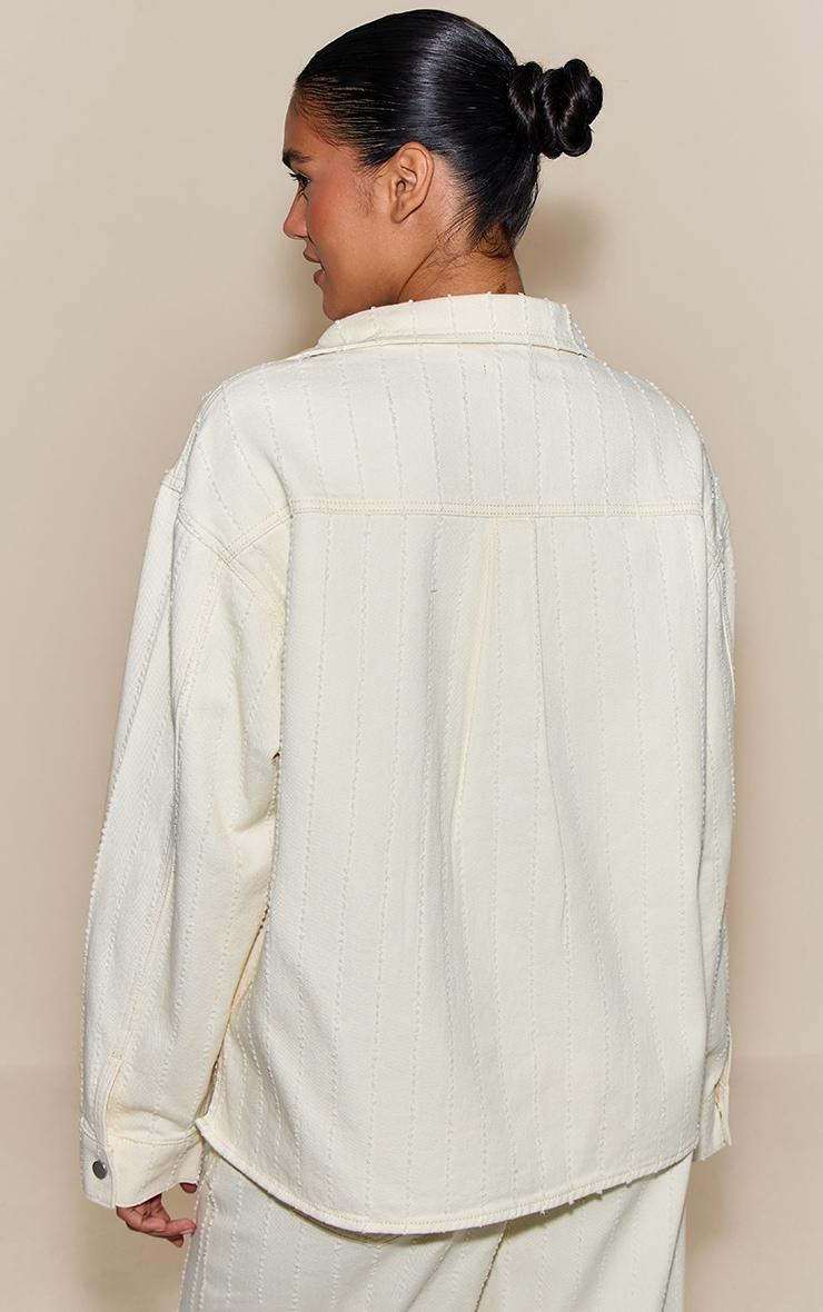 A fresh take on essential denim. The white boucle denim oversized shirt delivers an effortlessly cool vibe with its relaxed, generous cut, featuring a classic revere collar and a clean V-neck placket. Distinctive textured vertical stitching adds subtle visual depth, while twin patch pockets enhance its utility-inspired aesthetic. Complete the co-ordinated look with the matching denim pants, or layer over a simple Vest and high-waisted wide-leg jeans for an easy, confident statement that navigates any day.Length approx 48.5cm/19inch (Based on sample size US 4)Model wears size UK 8/ EU 36/ AUS 8/ US 4Model Height - 5ft 7inchp]:!mb-4inch>Brand: PrettyLittleThingCategory: DenimProduct type: Denim ShirtColor: WhiteMaterial: Rigid DenimNeckline: ShirtSleeves: LongOccasion: Day