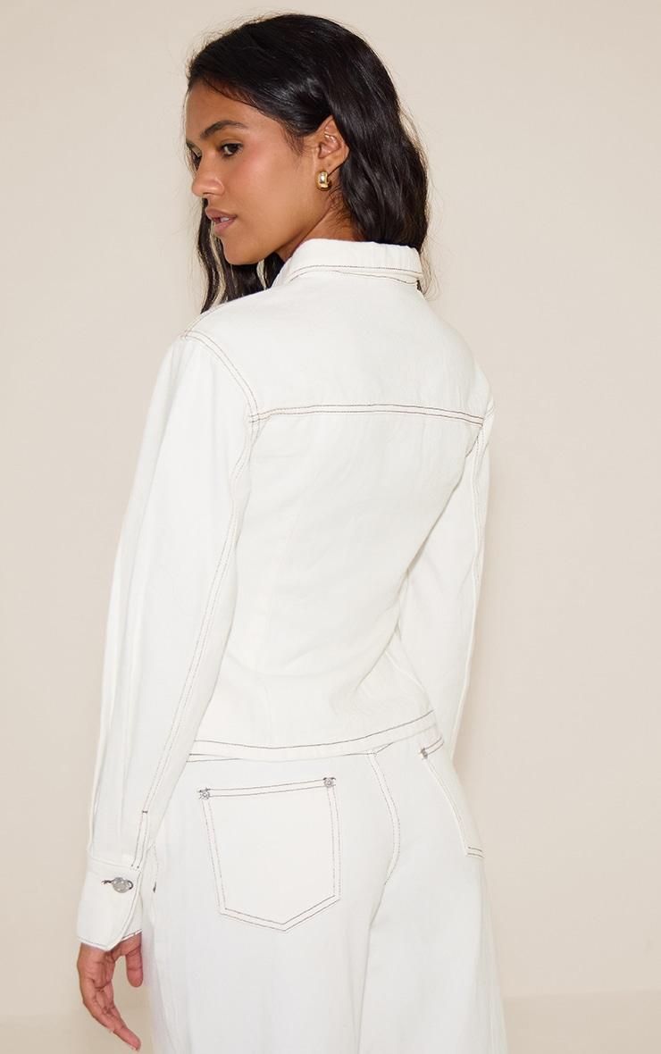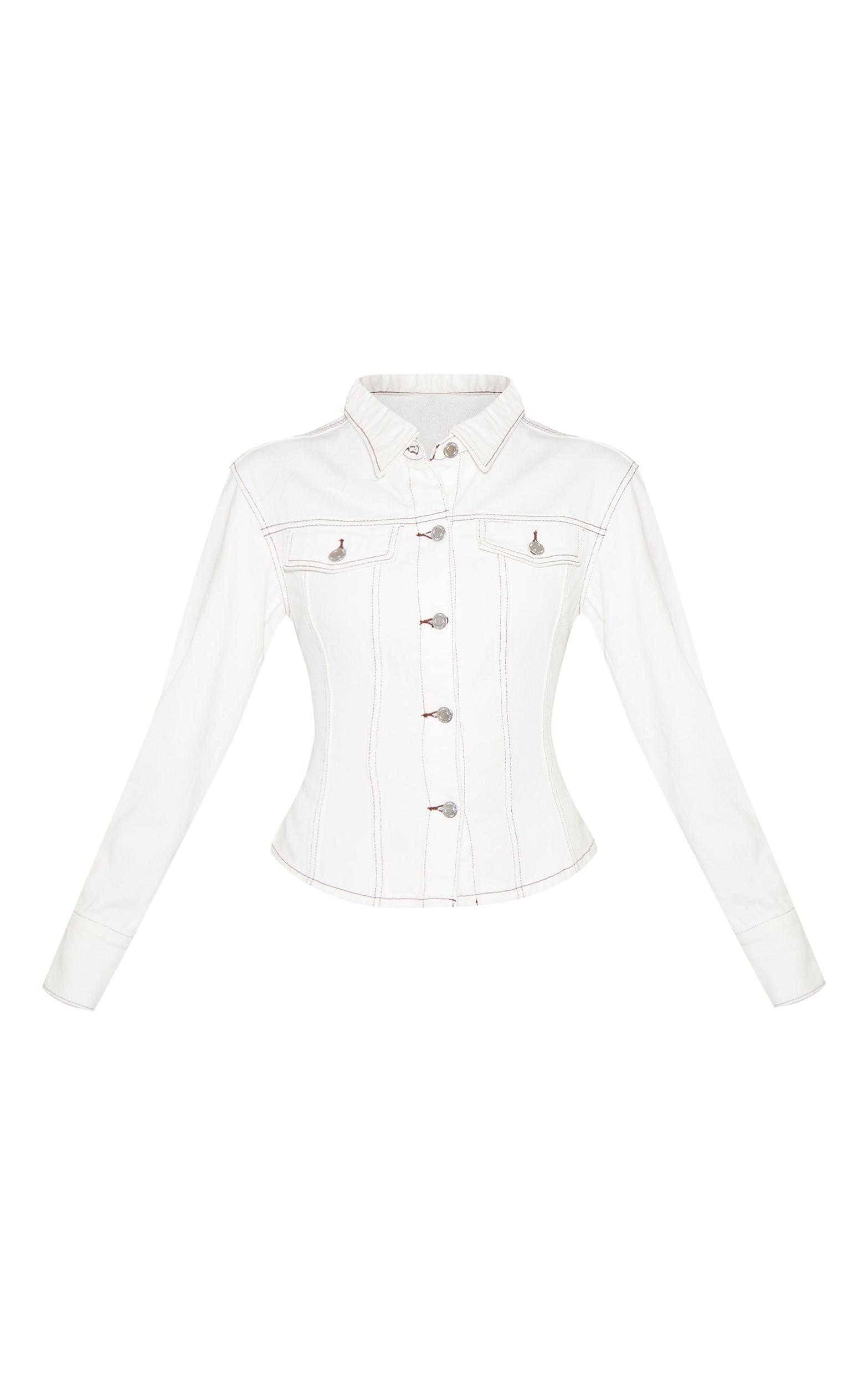 Elevate casual tailoring with the white contrast stitch long sleeve cinch waist denim jacket. Made from a rigid denim material with statement contrast stitching and a cinched waist, this jacket defines your shape. Team with the matching pants and sandals for smart off‑duty styling.Length approx 48.5cm/19inch (Based on sample size US 4)Model wears size UK 8/ EU 36/ AUS 8/ US 4Model Height - 5ft 7inchp]:!mb-4inch>Brand: PrettyLittleThingCategory: DenimProduct type: TopColor: WhiteMaterial: Rigid DenimSleeves: LongOccasion: Day