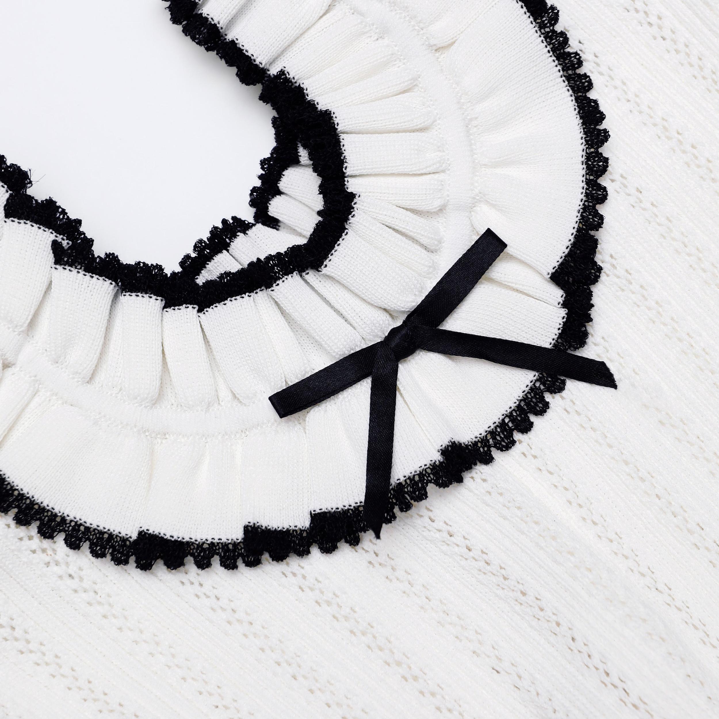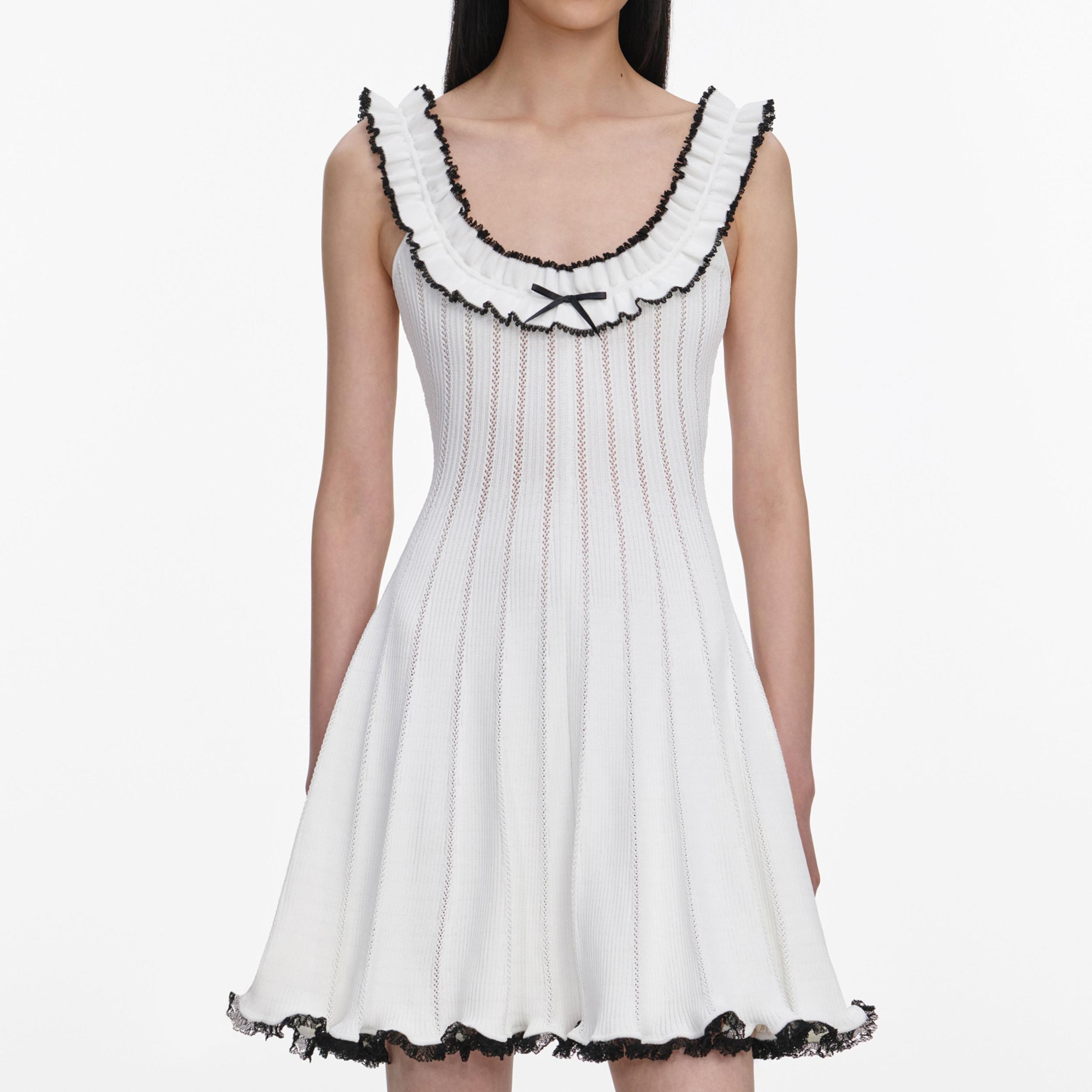 Chic and playful, contrast trims lend vintage athletic flair to this pointelle knit mini dress. A ruched neckline adds a crafty touch, while the ruffled hem plays well with flats and heels alike.True to sizeFabric has stretch Ruched necklineBow motifsContrast trimsModel is 5ft10/178cm and wears a size S