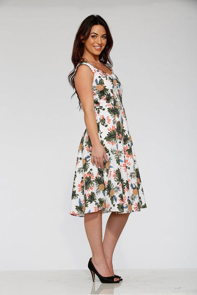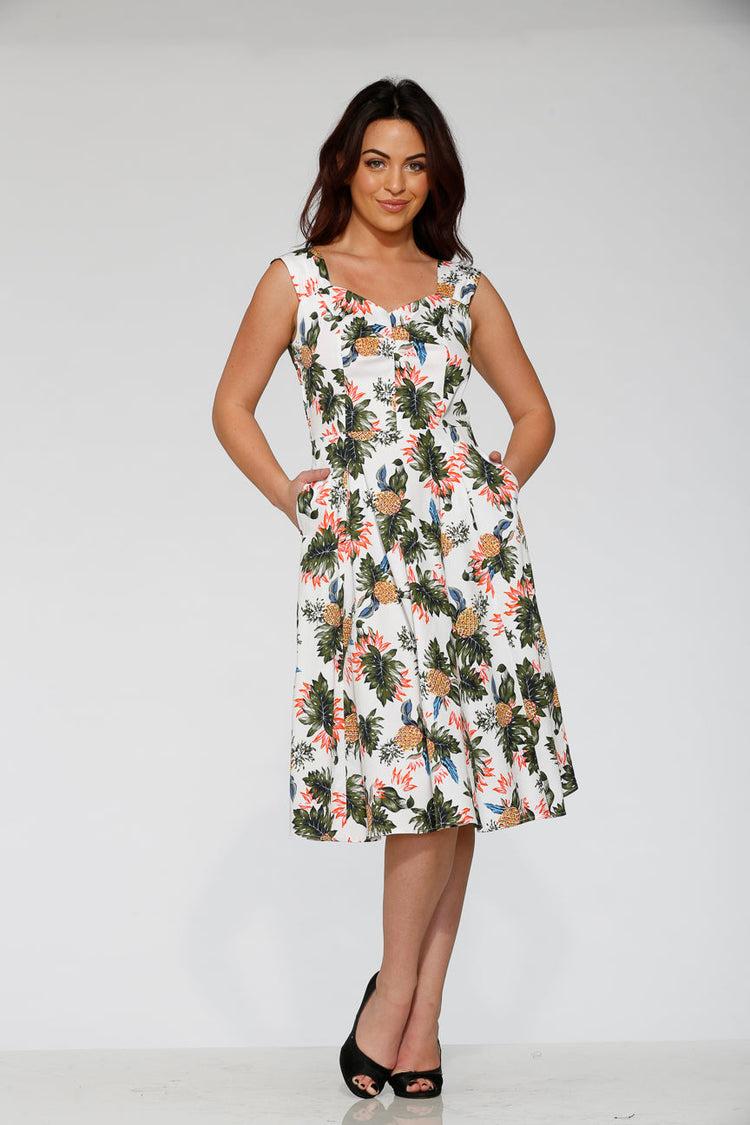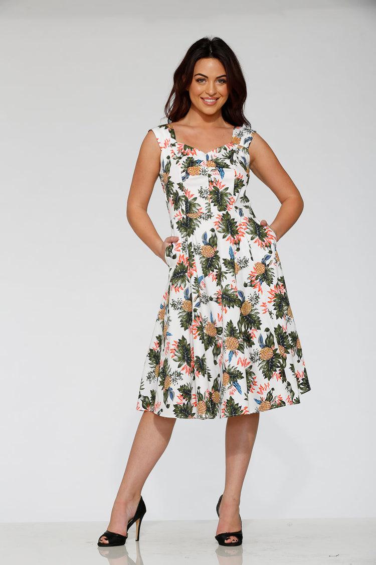 Say aloha to sunshine style in the Orchid Bloom White Hawaiian Swing Dress! With its lush tropical print of pineapples and vibrant florals on a crisp white backdrop, this retro-inspired beauty is made for vacations, garden parties, and twirls in the warm breeze. The sweetheart neckline and flattering swing skirt bring timeless charm, while the soft cotton-spandex blend keeps you comfy all day.97% Cotton, 3% Spandex – fabric provides stretchCenter back zipperLength: 41"ImportedMachine wash cold, tumble dry low or hang to air-dry