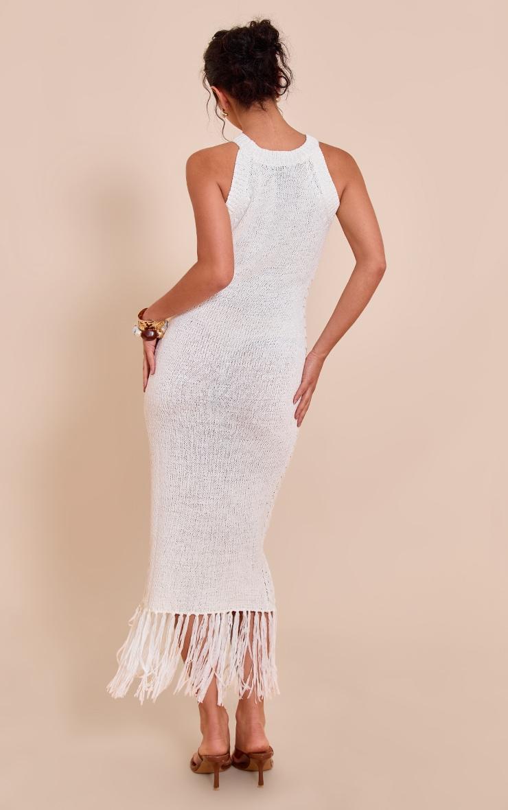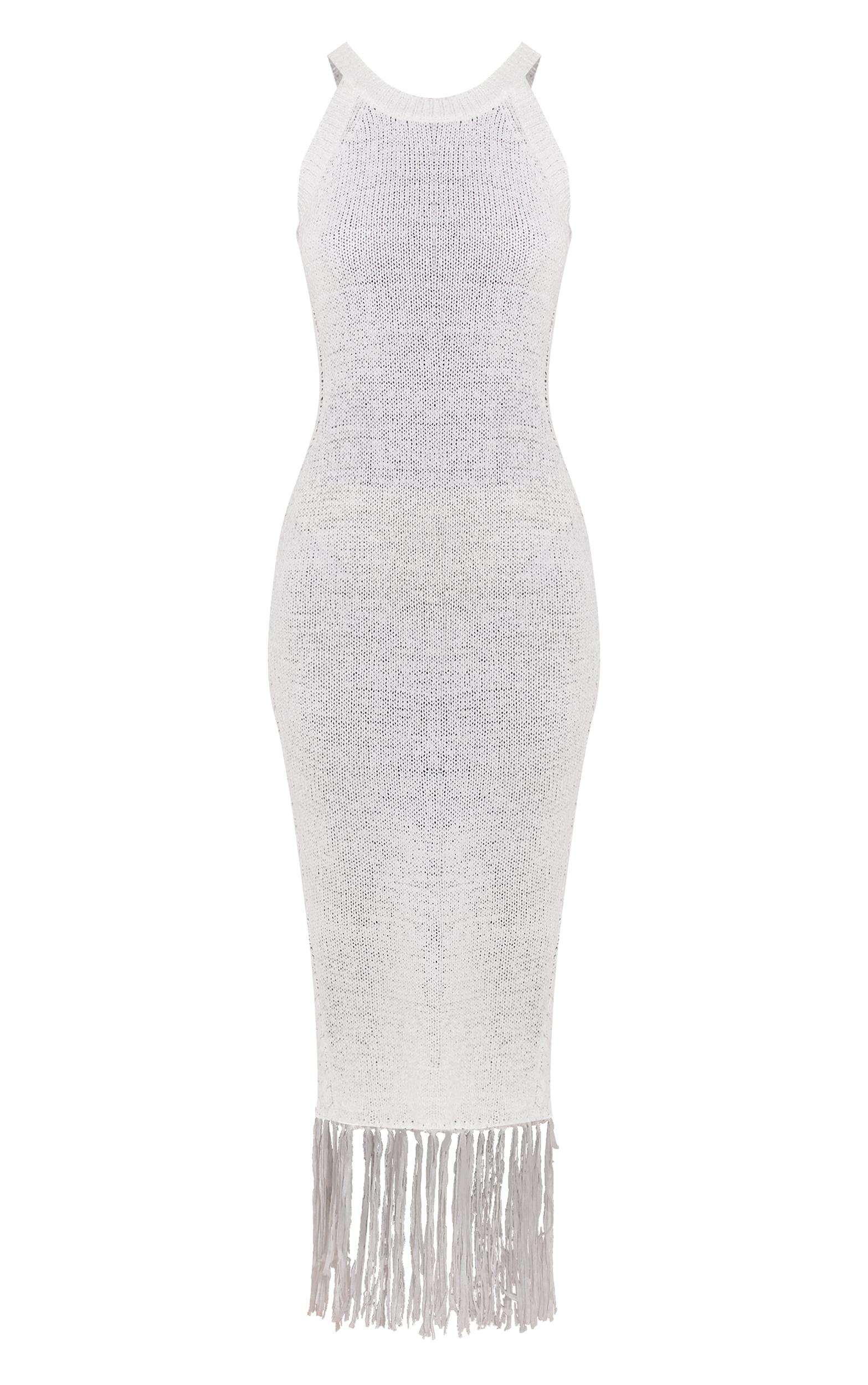 Make a statement in the white high neck maxi fringe knit dress. Designed in a white hue with a soft knit material, a fringe detailing and a high neckline, this piece is both modern and elegant. Pair with heels and minimal jewelry for a standout occasion outfit.Length approx 155cm/61inch (Based on sample size S)Model wears size SModel Height - 5ft 7inchp]:!mb-4inch>Brand: PrettyLittleThingCategory: KnitwearProduct type: Bodycon DressColor: WhiteMaterial: Brushed KnitDesign: PlainSleeves: Spaghetti StrapOccasion: Day