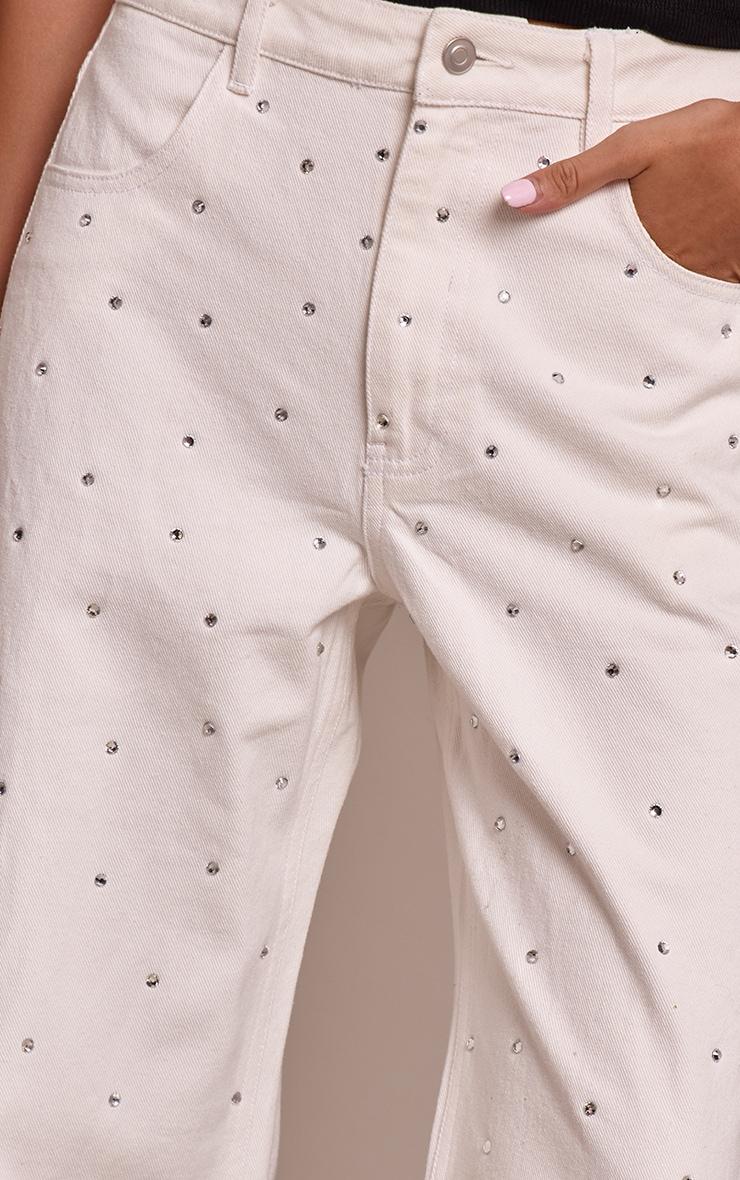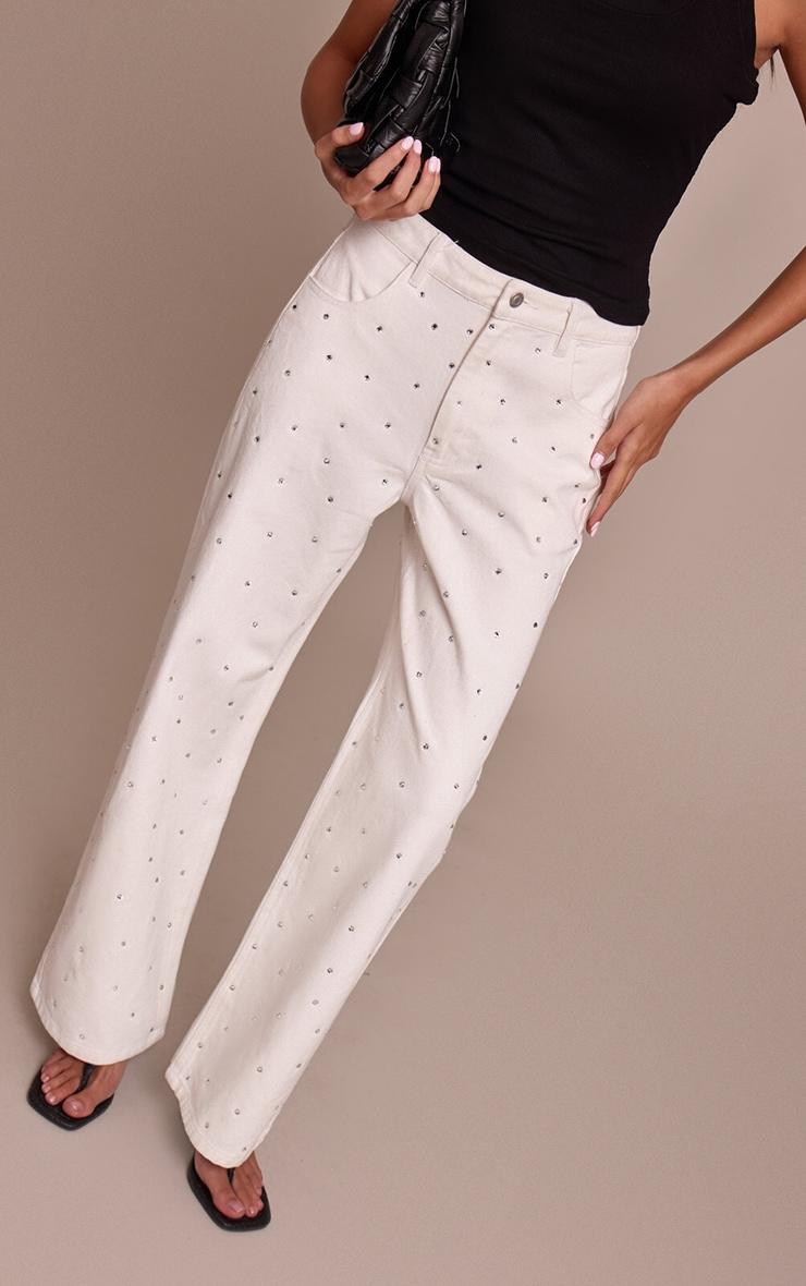 Bring sparkle to your denim edit with the white high waist diamante straight leg jeans. Made from structured denim with scattered diamante detail, they’re designed to catch the light. Pair with a satin corset and strappy heels for after-dark energy or dress them down with a cropped knit and sneakers.Length approx 76cm/30inch (Based on sample size US 4)Model wears size UK 8/ EU 36/ AUS 8/ US 4Model Height - 5ft 7inchp]:!mb-4inch>Category: DenimProduct type: Straight Leg JeansColor: WhiteMaterial: Rigid DenimOccasion: Evening