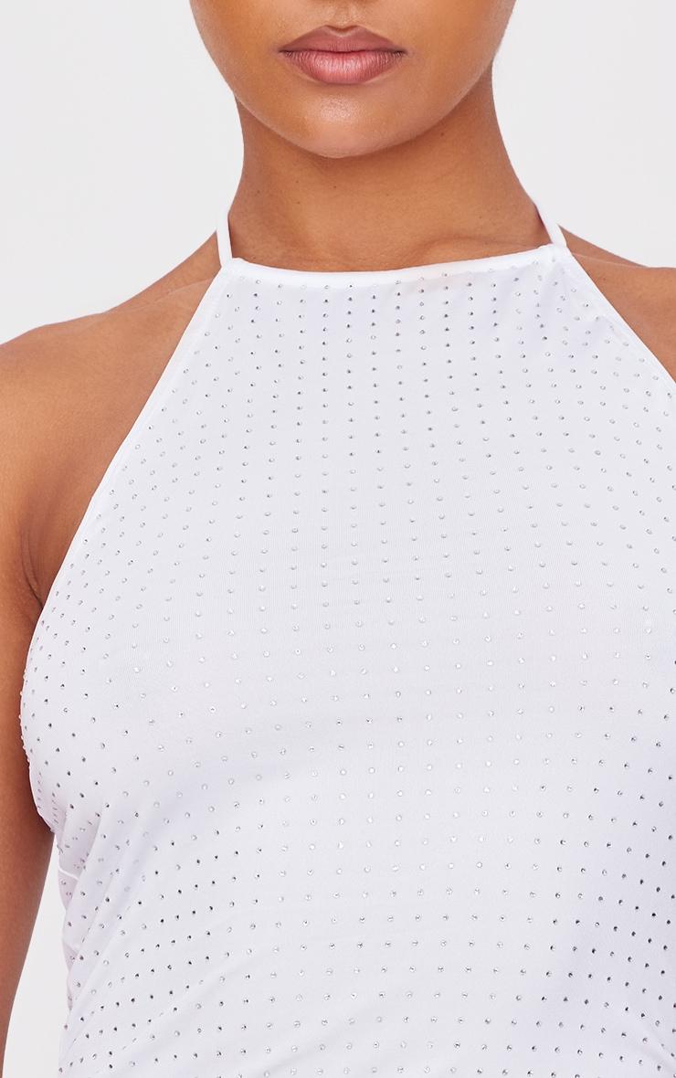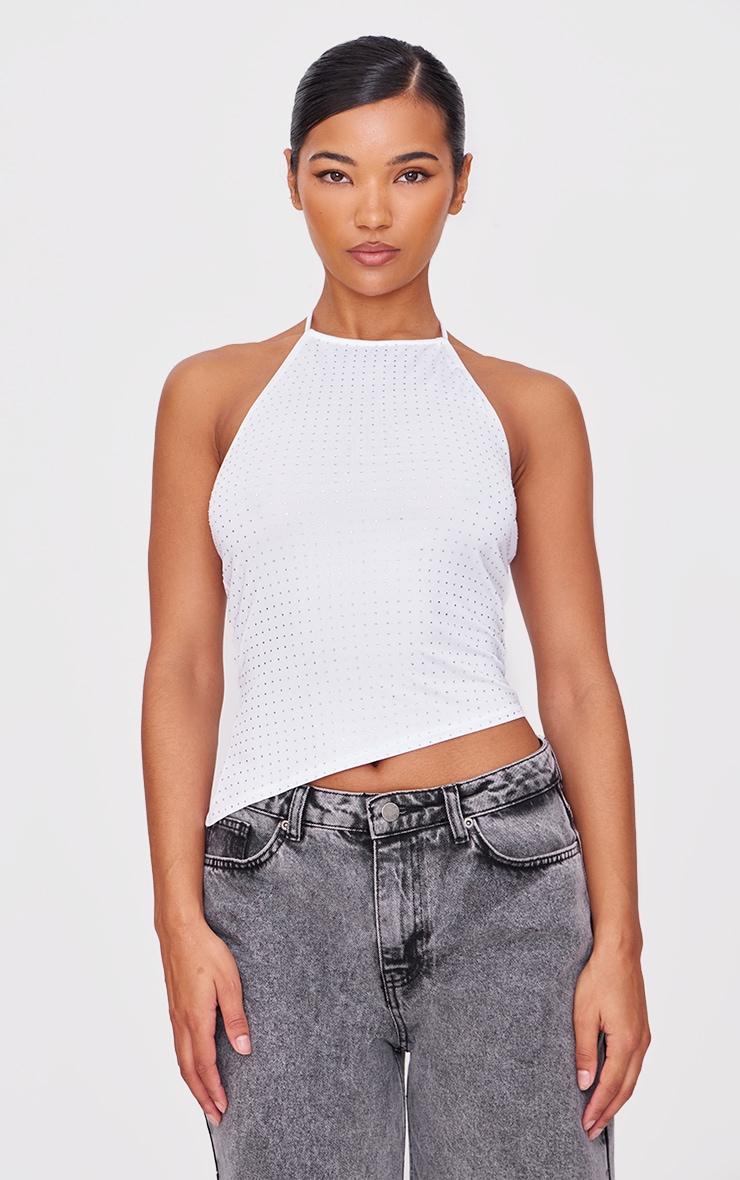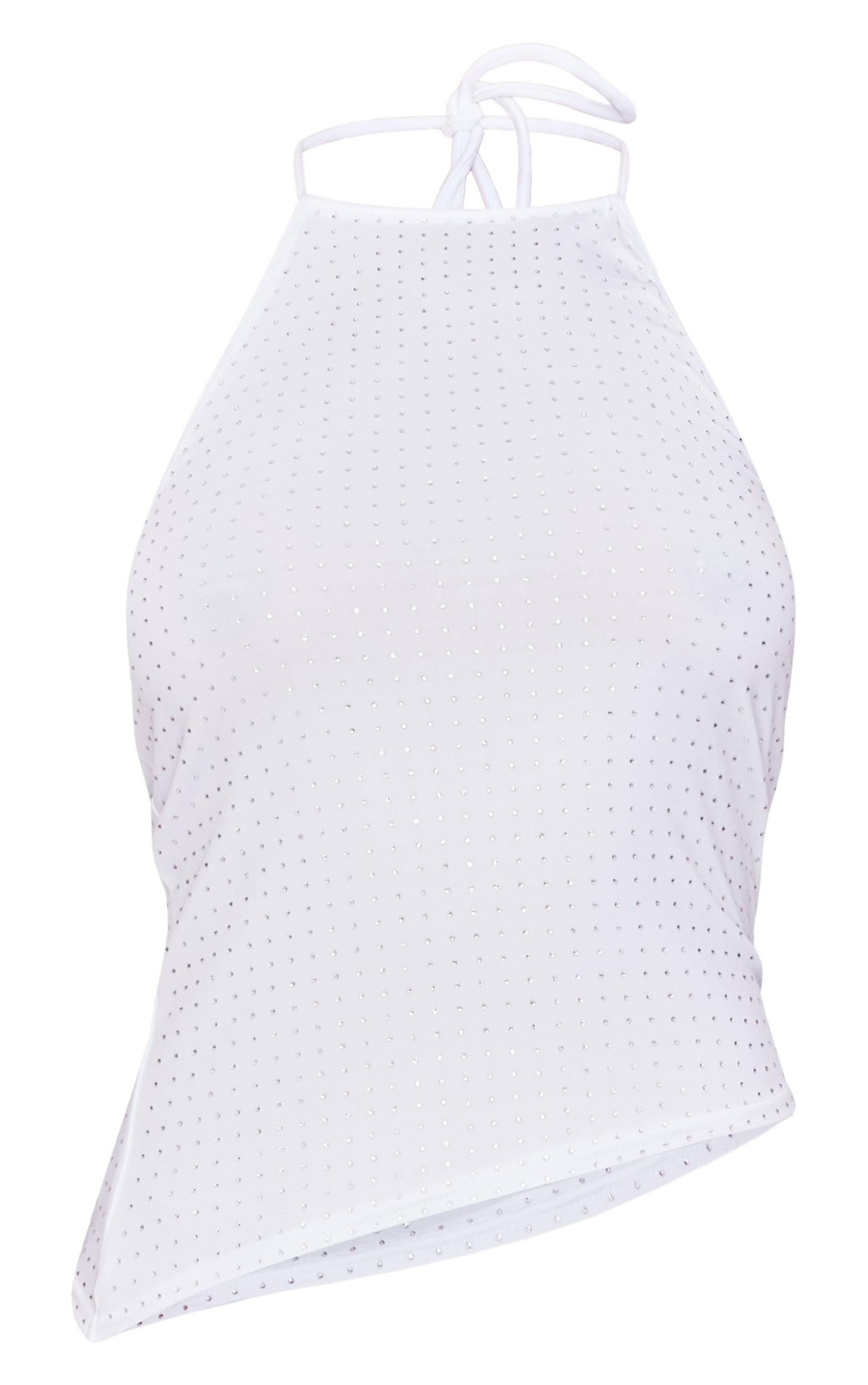 Elevate your basics collection wtih this white hot fix halterneck open back long top. Brought to you in a crisp white shade, with a luxe hot fix design and a flattering open back detail, how can you say no? This top pairs perfectly with a pair of wide leg jeans and silver court heels for a finished look. Length approx 48cm/19inch (Based on a sample size UK 8) Model wears size UK 8/ EU 36/ AUS 8/ US 4Model Height - 5ft 6inchp]:!mb-0inch>Category: TopsProduct type: Fitted T-ShirtColor: WhiteMaterial: Slinky JerseyDesign: PlainNeckline: HalterneckSleeves: SleevelessOccasion: Evening