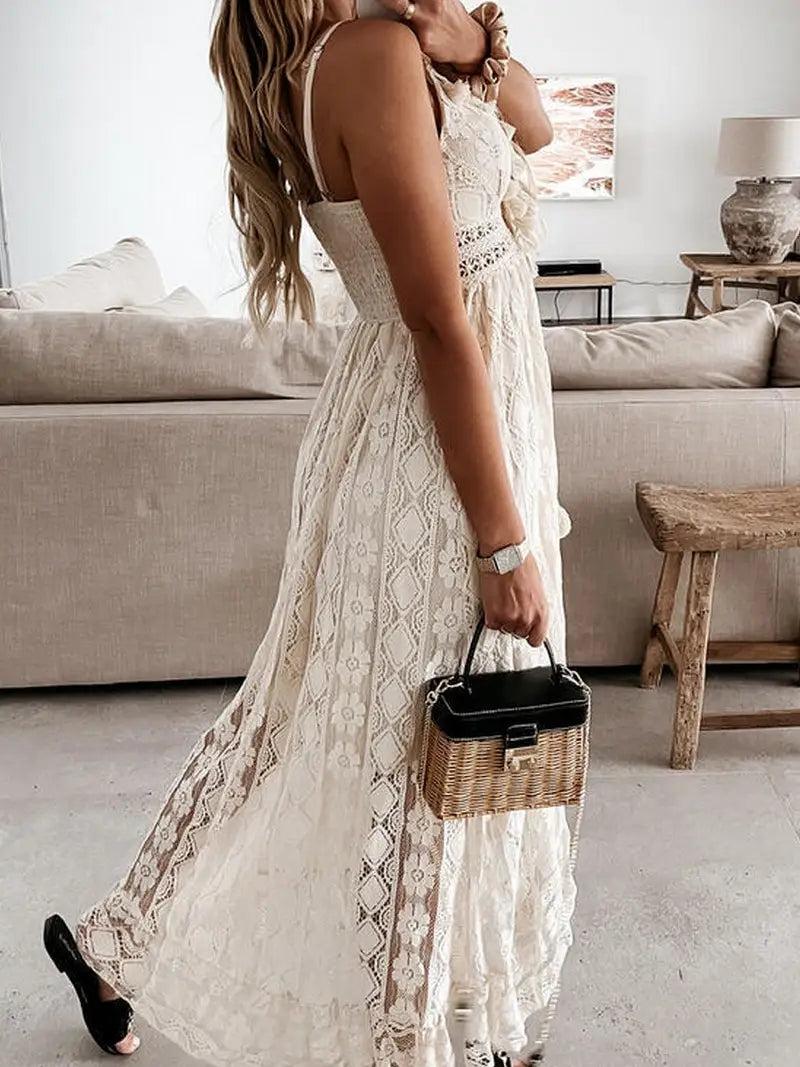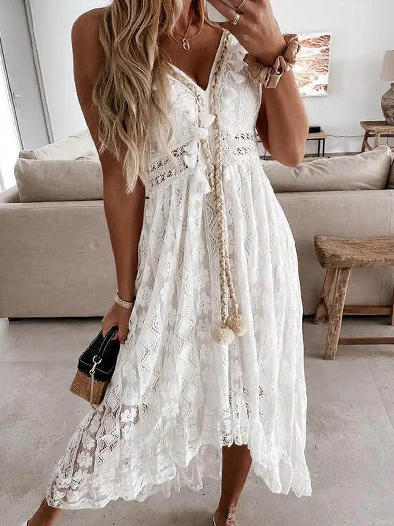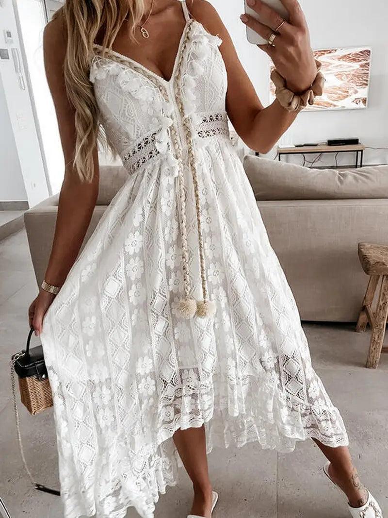 This breathtaking dress boasts intricate white lace and playful tassels, making it the perfect bohemian addition to your wardrobe! The White lace and tassels make it perfect for summer! Pair it with your denim jacket and you are ready for dinner by the sea!