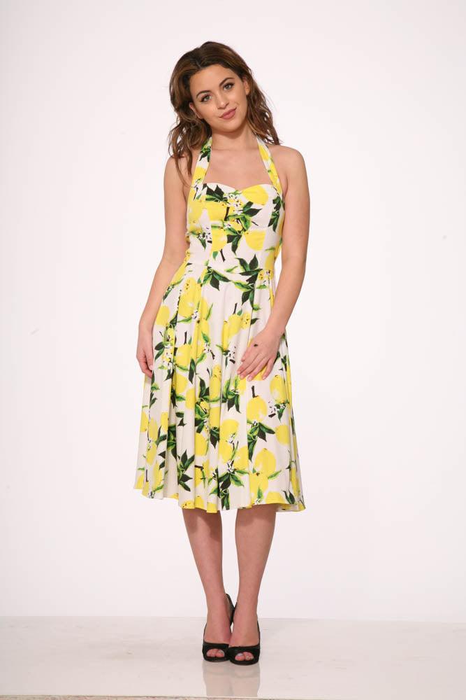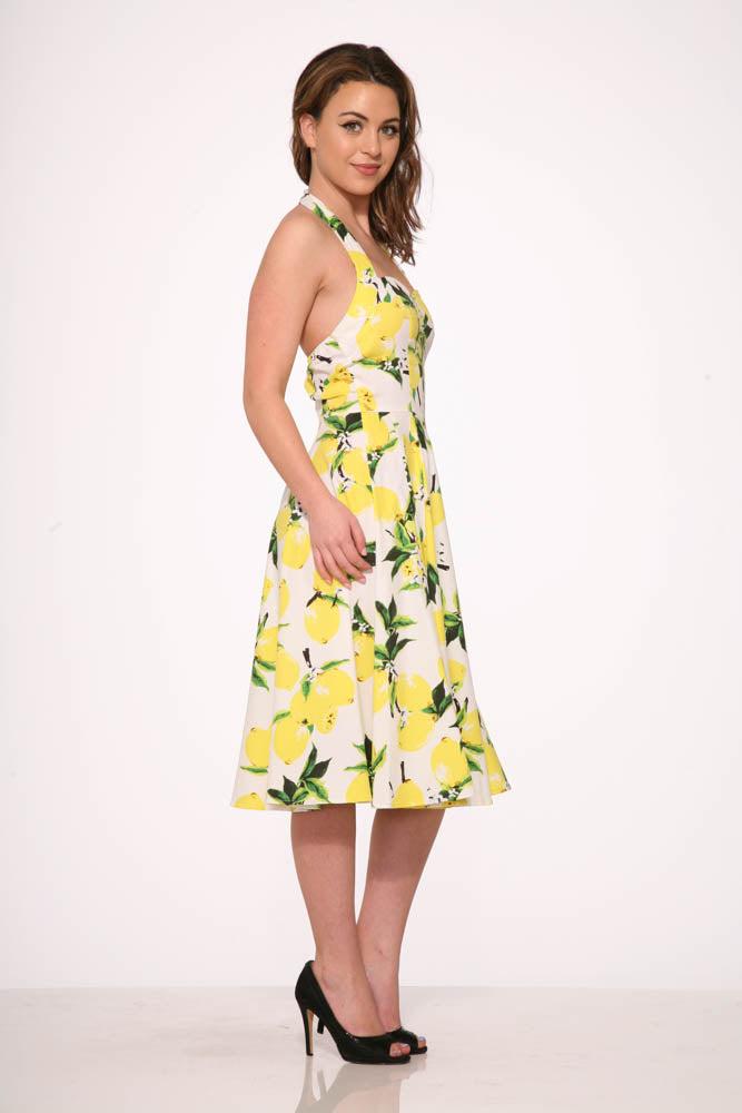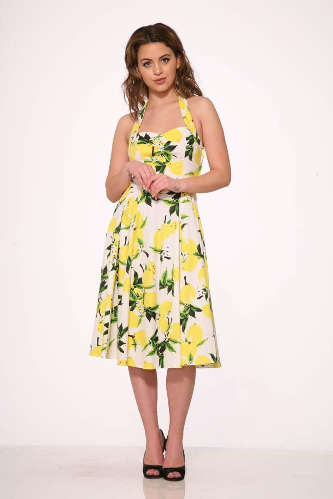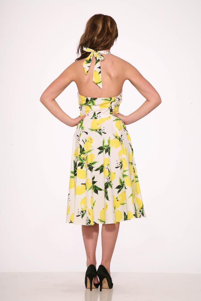 When life gives you lemons—wear them! The Orchid Bloom White Lemon Halter Swing Dress is a zesty, vintage-inspired stunner featuring a fresh lemon print on a crisp white backdrop. With its flattering halter neckline and full swing skirt, this dress brings a burst of sunshine to every twirl. The cotton-spandex blend ensures a sweet and comfortable fit, perfect for picnics, parties, or just brightening your day.Details:By Orchid Bloom97% Cotton, 3% Spandex – fabric provides stretchSide zipper closureLength: 41"ImportedMachine wash cold, tumble dry low or hang to air-dry