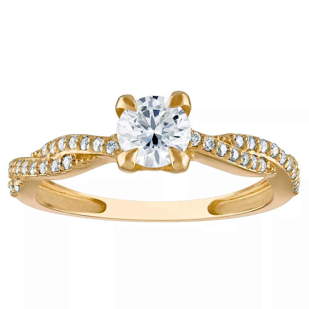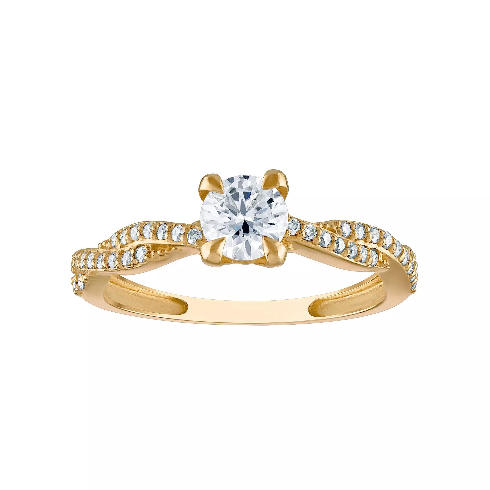 Demonstrate your undying devotion with this 10k gold White Lotus twisted band lab-created moissanite engagement ring. Demonstrate your undying devotion with this 10k gold White Lotus twisted band lab-created moissanite engagement ring. FEATURES Band width: 5.8 mm Nickel free Metal: 10k gold Finish: polished Packaging: boxedSTONE DETAILS Stone type: lab-created moissanite Total weight: 1 ct. Center stone size: 5.25 mm Center stone weight: 5/8 ct. Shape: round Setting: prong Gemstones may have been treated to enhance their appearance. Special care may be required. Please visit our Gemstone Treatment & Special Care Guide for more information. Please note, due to the high value of this item, a signature may be required upon delivery. Size: 7. Color: Yellow. Gender: female. Age Group: adult.