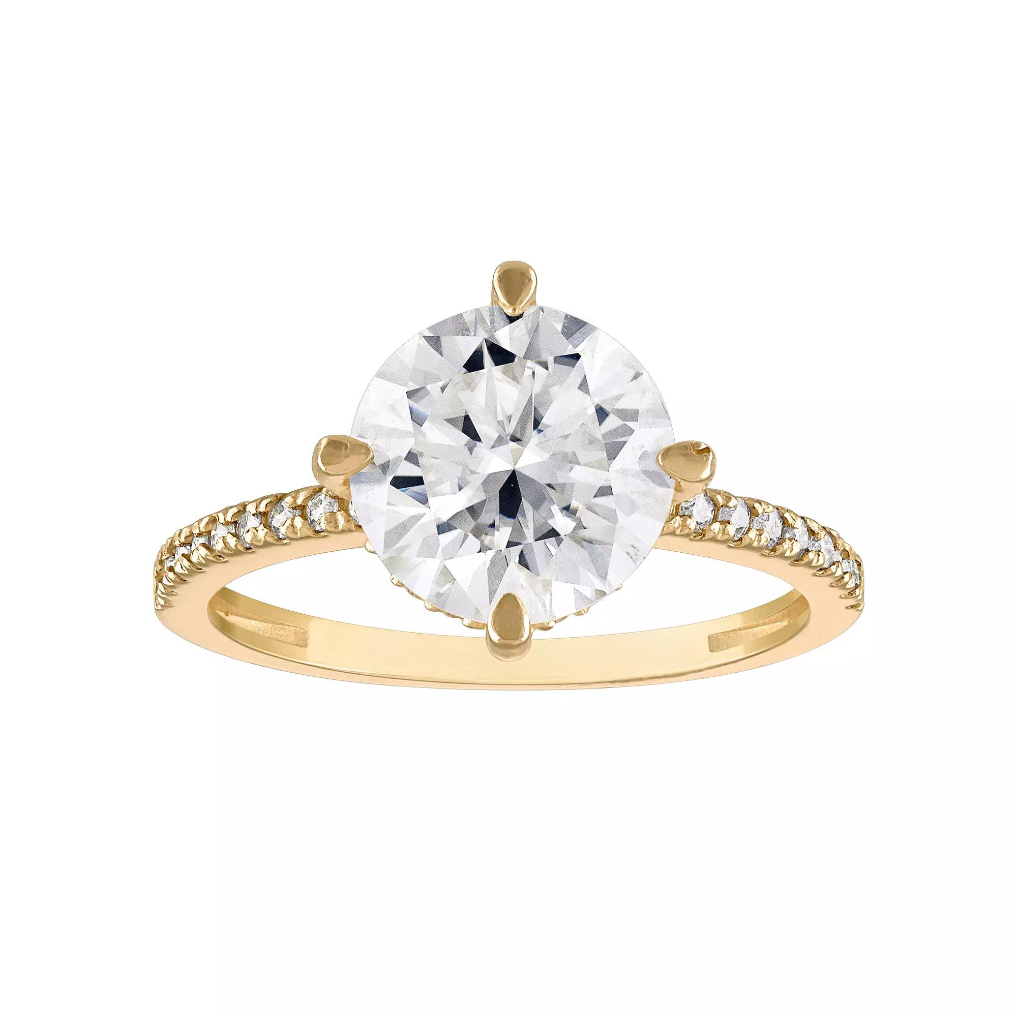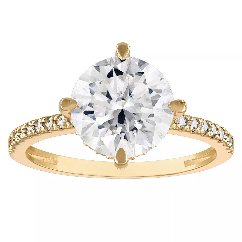 Display your devotion in eye-catching style with this sparkling lab-created moissanite White Lotus 10k gold engagement ring. Display your devotion in eye-catching style with this sparkling lab-created moissanite White Lotus 10k gold engagement ring. FEATURES Band width: 10.9 mm Nickel free Metal: 10k gold Finish: polished Packaging: boxedSTONE DETAILS Stone type: lab-created moissanite Total weight: 3 1/3 ct. Center stone size: 9 mm Center stone weight: 3 ct. Shape: round Setting: prong Gemstones may have been treated to enhance their appearance. Special care may be required. Please visit our Gemstone Treatment & Special Care Guide for more information. Please note, due to the high value of this item, a signature may be required upon delivery. Size: 5. Color: Yellow. Gender: female. Age Group: adult.