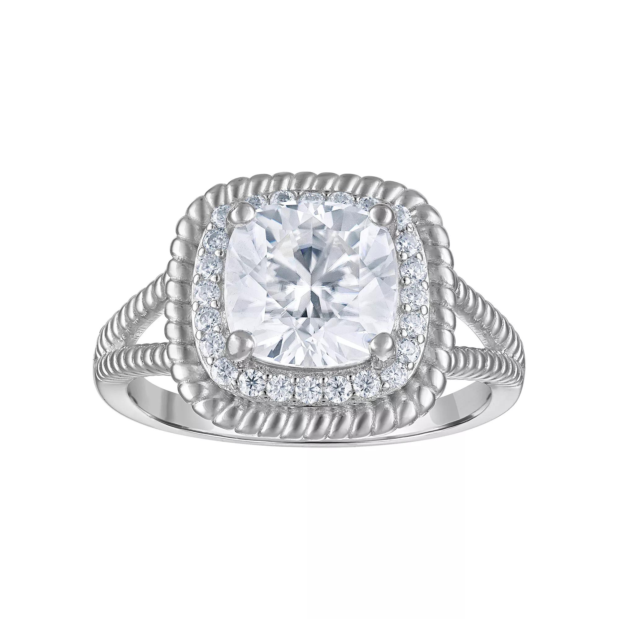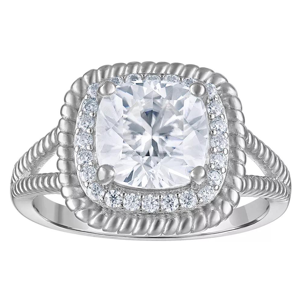 This breathtaking White Lotus ring features a radiant lab-created moissanite center stone surrounded by a sparkling halo of additional moissanites. Crafted in elegant sterling silver, this ring offers timeless beauty and exceptional brilliance for your special day. Click on this JEWELRY & WATCHES GUIDE to learn about fit, styles, materials and more! This breathtaking White Lotus ring features a radiant lab-created moissanite center stone surrounded by a sparkling halo of additional moissanites. Crafted in elegant sterling silver, this ring offers timeless beauty and exceptional brilliance for your special day. Click on this JEWELRY & WATCHES GUIDE to learn about fit, styles, materials and more! FEATURES Width: 13.5 mm Shank style: traditional Band fit: half-round Nickel free Metal: sterling silver Plating: 14k gold Finish: polished Packaging: boxedSTONE DETAILS Stone type: lab-created moissanite Total weight: 2 1/2 ct. Center stone weight: 2 1/5 ct. Center stone size: 8 mm Shape: cushion cut Setting: prong Gemstones may have been treated to enhance their appearance. Special care may be required. Please visit our Gemstone Treatment & Special Care Guide for more information. Size: 9. Gender: female. Age Group: adult.