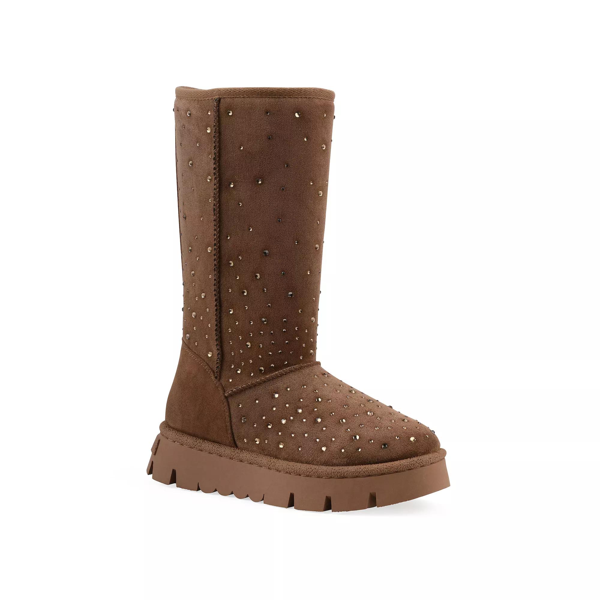 Unleash your inner sparkle with the Tripp tall shaft pull-on boots from White Mountain. Featuring dazzling stone detailing and chic crystal embellishments, these stylish boots not only resist water and stains but also elevate any outfit, ensuring you shine with confidence wherever you go. Click this FOOTWEAR GUIDE to find the perfect fit and more! - https://www.kohls.com/feature/shoesizeguide.jsp. FEATURES: Treated with 3M Scotchgard™ for water and stain resistance, Dusted with allover stone detailing for a head-turning shimmer, Tall shaft silhouette for laid-back vibes, Crystal embellishment adds a high-wattage twist. DETAILS: Round toe, Pull-on closure, Heel height: 1.75", Platform height: 1.25", Sole style: Lug outsole, Imported. FIT & SIZE: Mid-calf shaft, 14.5" circumference, 11.25" height. MATERIAL & CARE: Product contains faux fur, Polyester upper and lining, Polyurethane footbed, Foam midsole, Manmade outsole, Spot clean. Size: 11 Med. Color: Chestnut Faux Suede. Gender: female. Age Group: adult. Material: SYNTHETIC.
