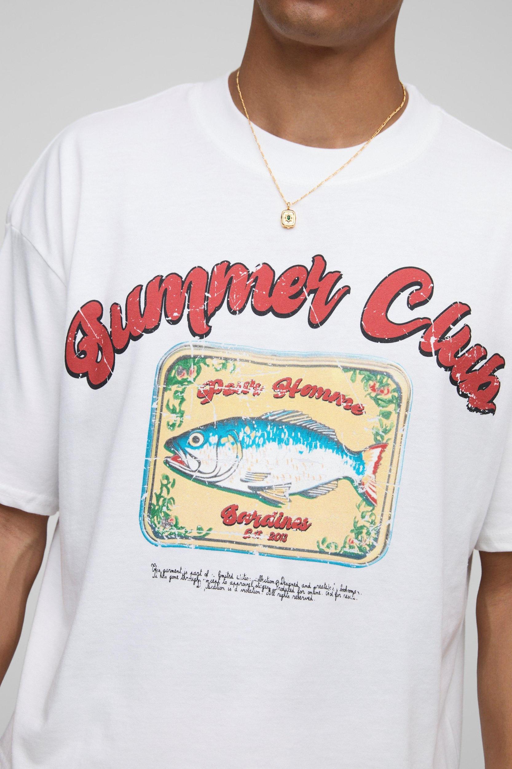 White Oversized Boxy Extended Neck Sardine Summer Club Printed T-Shirt | boohooMAN USA