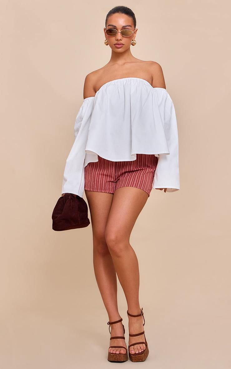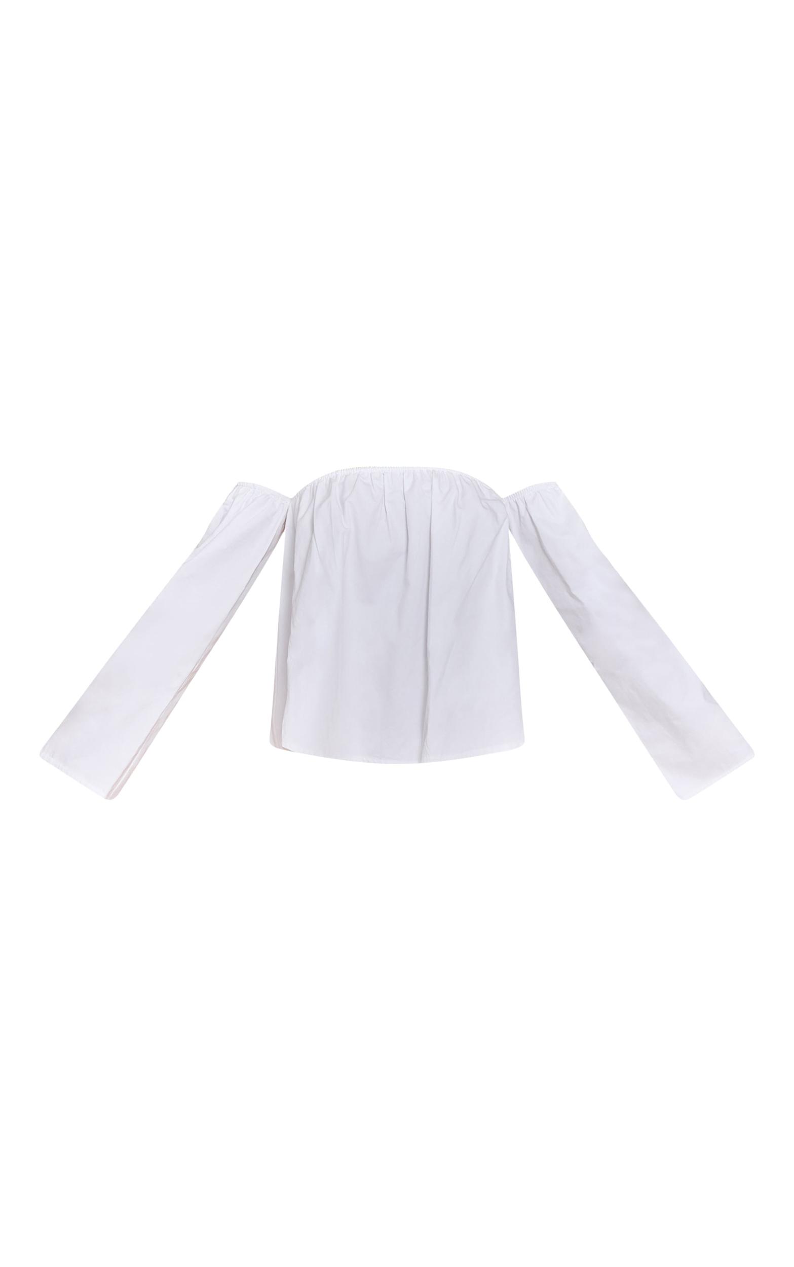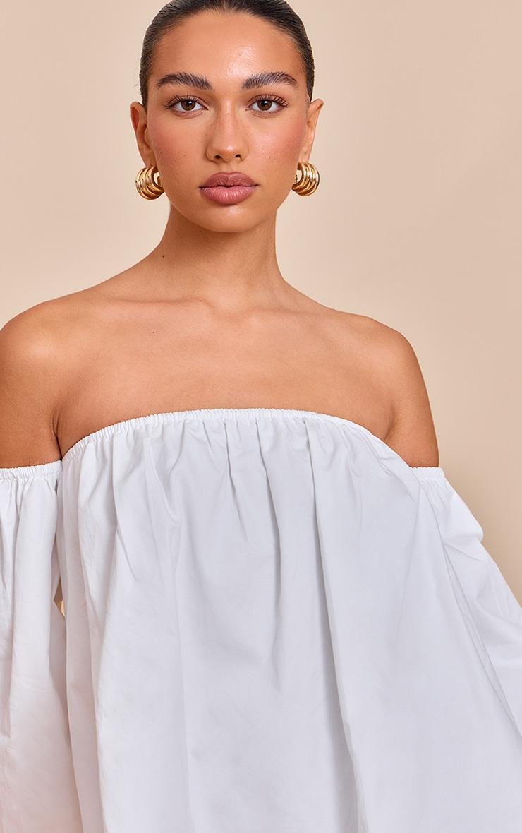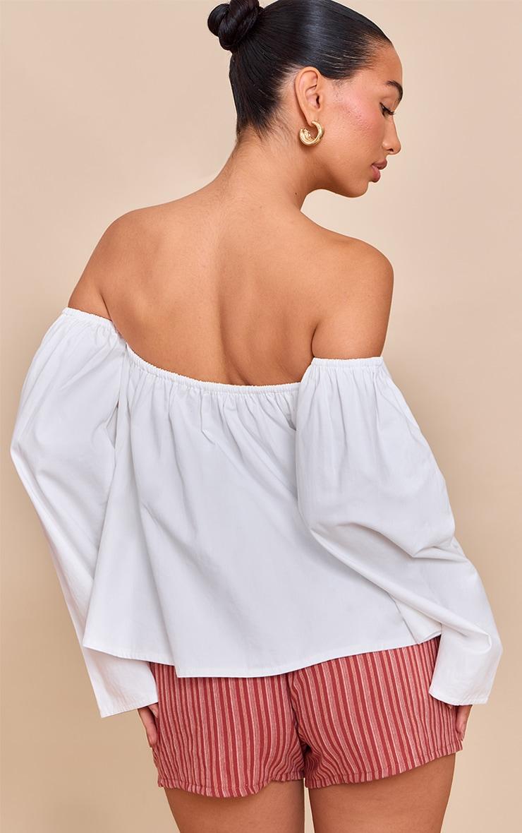 Opt for a feminine look in this white peach skin floaty bardot top. Crafted from white material, this top has exaggerated long sleeves with a bardot neckline and a floaty fit. Pair it with shorts, platform heels and sleek sunglasses for a look perfect for daytime events.Length approx 48.5cm/19inch (Based on sample size US 4)Model wears size UK 8/ EU 36/ AUS 8/ US 4Model Height - 5ft 7inchp]:!mb-4inch>Brand: PrettyLittleThingCategory: TopsProduct type: Bardot TopColor: WhiteMaterial: Woven CrepeDesign: PlainNeckline: BardotSleeves: ShortOccasion: Day