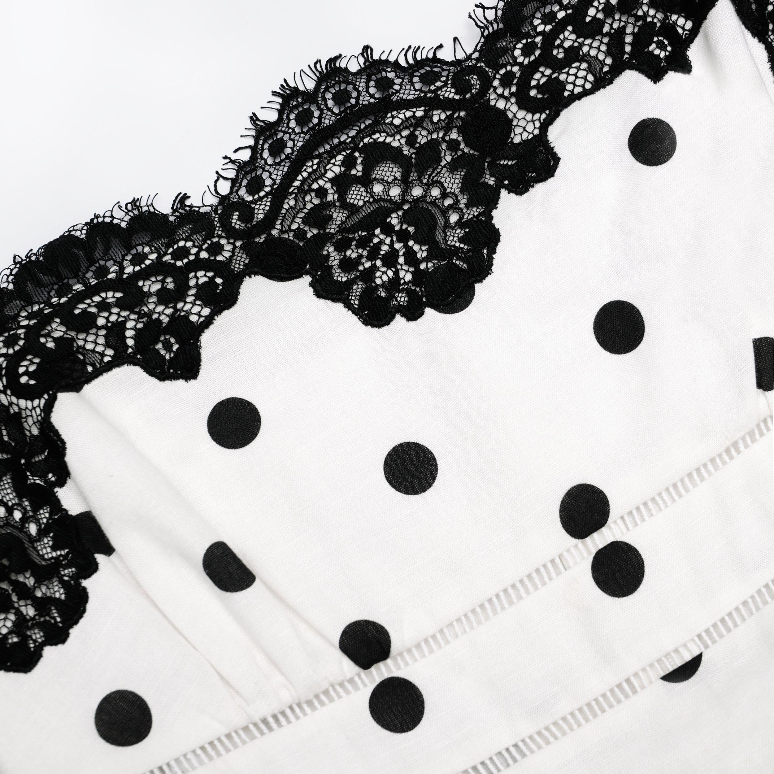 Feminine and fun, this polka dot print midi dress is framed by chic black lace trim around the neckline. A peplum waist sculpts out the form – add heels for garden parties or a day at the races. Fitted styleThis style has minimal stretchConcealed zip closure at backLace trimsPeplum waistModel is 5ft10/178cm and wears a size UK 6