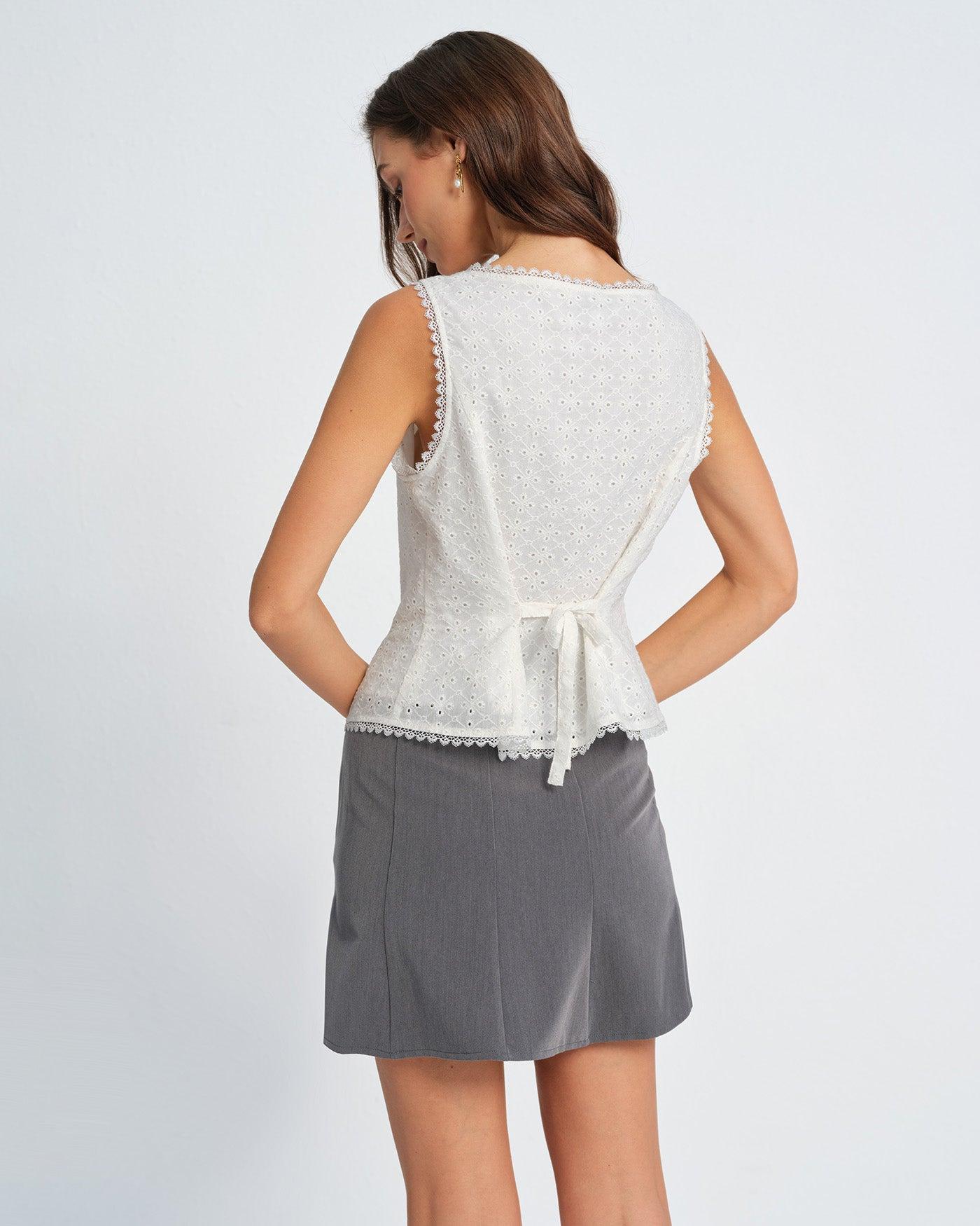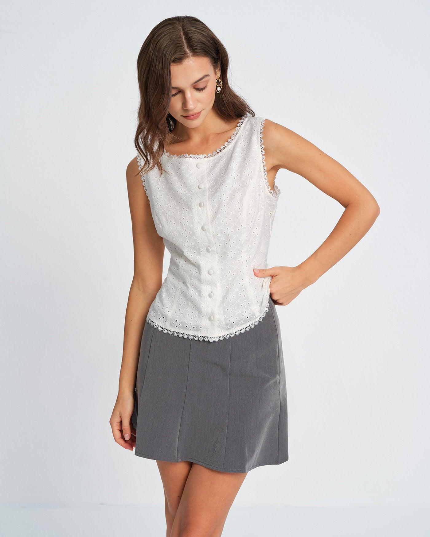 - Occasion: Daily - Style: Elegant - Season: Spring, Summer - Top Length: Hip - Sleeve Length: Sleeveless - Closure Type: Single Breasted - Pattern Type: Solid - Embellishment: Textured, Lace, Button - Neckline: Boat Neck - Fit: Slim - Fabric: Cotton 100.0% - Lining: Polyester - Material: Worsted woven