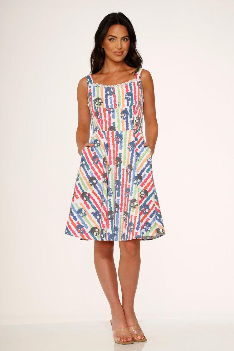 Bring bold energy and a splash of color to your twirl with the Orchid Bloom White Skulls Rainbow Swing Dress! Featuring a playful print of vibrant rainbow skulls against a crisp white backdrop, this retro-inspired fit-and-flare is a perfect mix of sweet and rebellious. Crafted from a comfy cotton-spandex blend, it’s ready for sunshine, smiles, and making a statement wherever you go.Details:By Orchid Bloom97% Cotton, 3% SpandexImportedMachine wash cold, tumble dry low or hang to air-dry