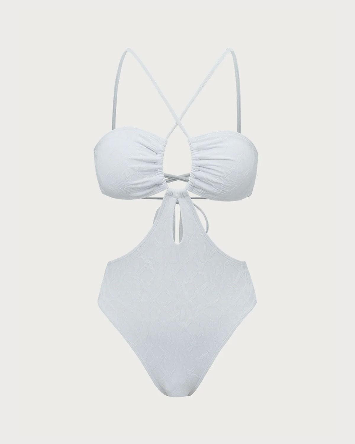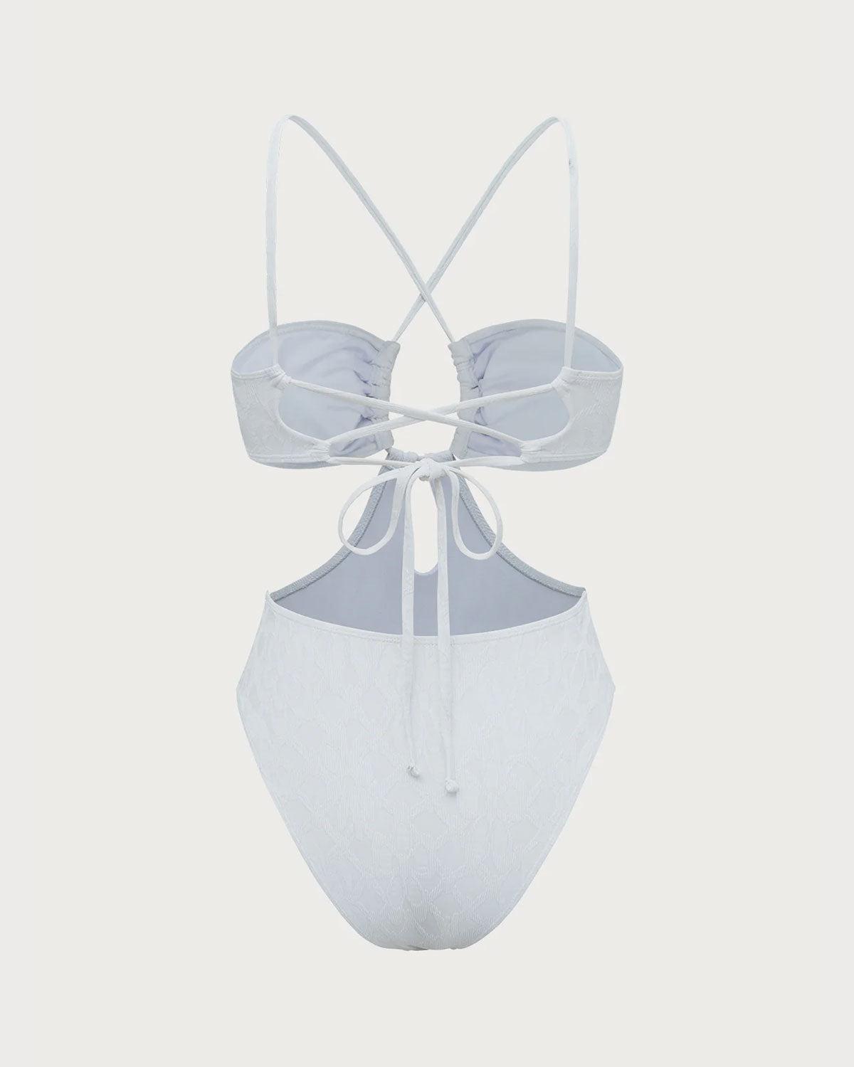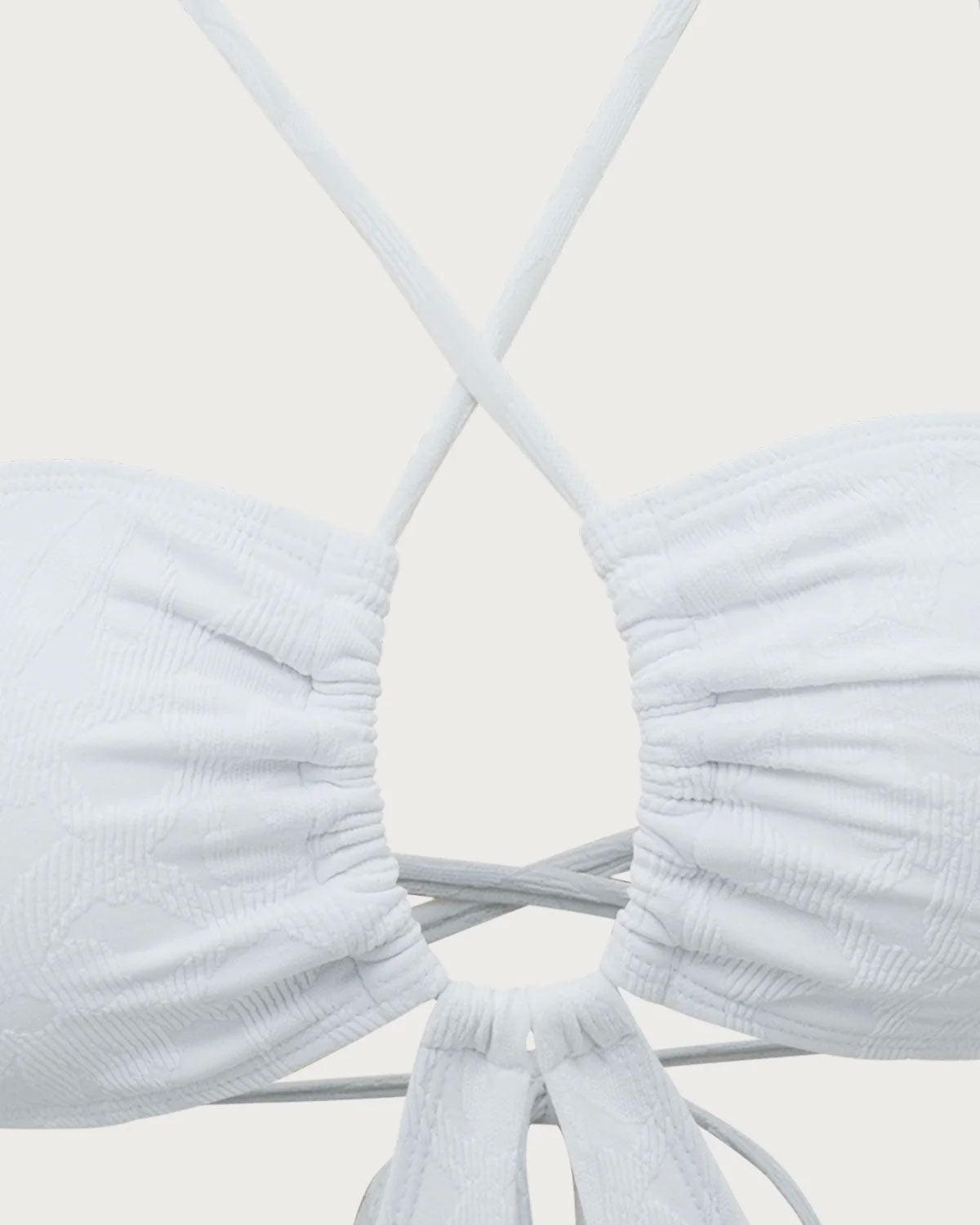Back Neckline: Strappy Fabric Stretch: High Stretch Bra Style: Full Cup Pattern Type: Floral, Geometric Embellishment: Knot, Tie, Cut Out, Textured, Jacquard Neckline: Halter Fabric: Spandex 7.0%, Polyamide 93.0% Lining: Polyester 90.0%, Spandex 10.0% Leg Opening: Mid-Cut Leg Padding: Removable Soft Cups Bottom Coverage: Moderate Bottom Coverage