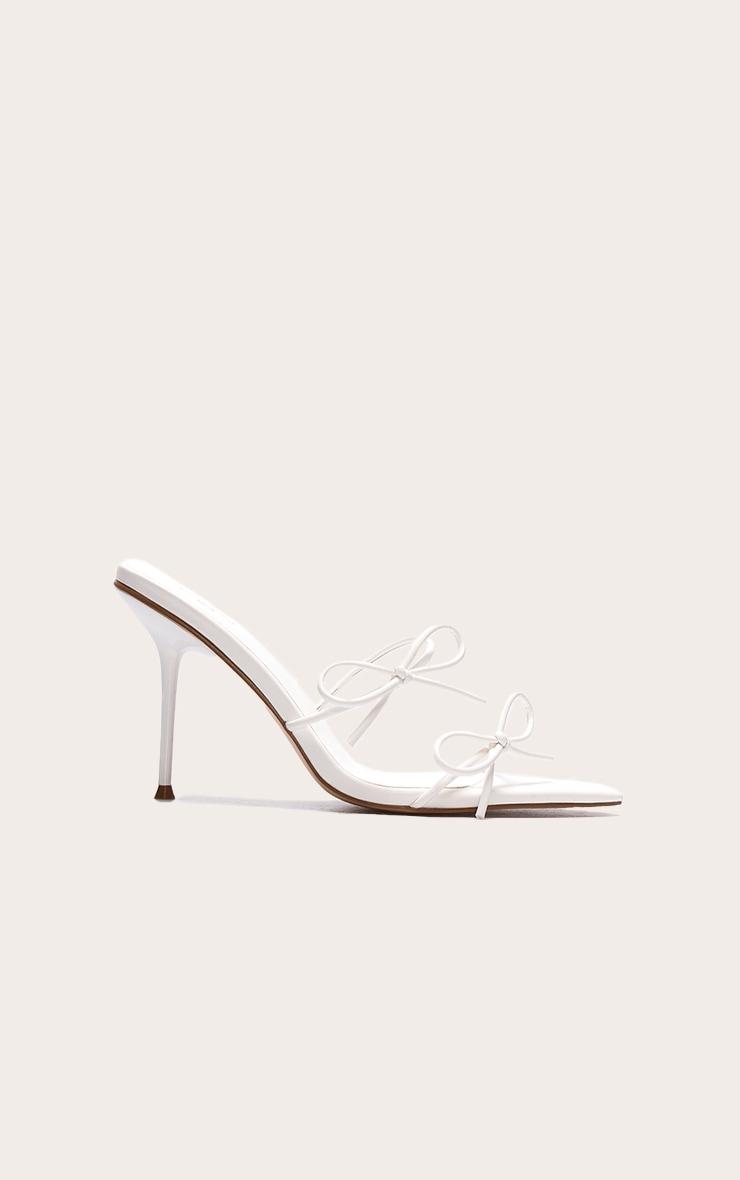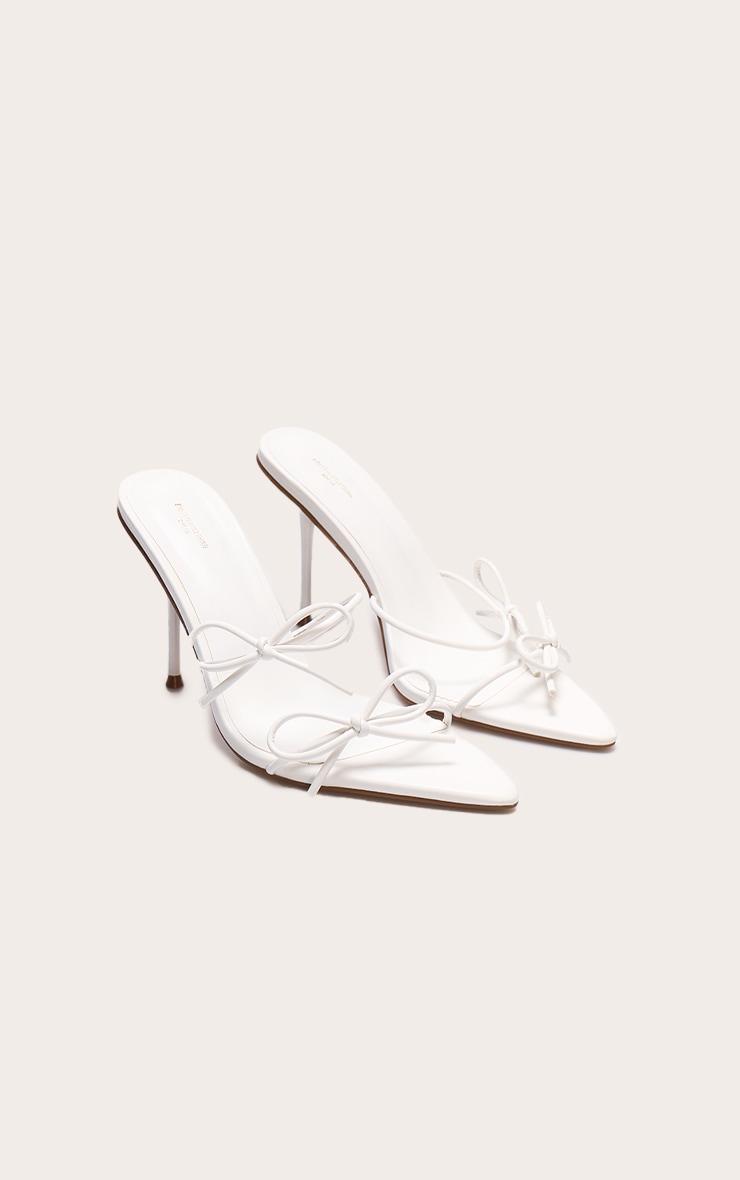 Crafted from white PU material, these 4.5 inch stiletto heels feature delicate bow strap detailing, a comfortable wide fit, pointed toes and a classic slip on fit. Finish off your evening event look with these white wide fit pu point toe multi bow high stiletto heeled mules, ideal for pairing with a chic mini dress, tonal shoulder bag and dainty silver earrings.p]:!mb-4inch>Brand: PrettyLittleThingCategory: FootwearProduct type: Wide Fit HeelsColor: WhiteOccasion: Evening