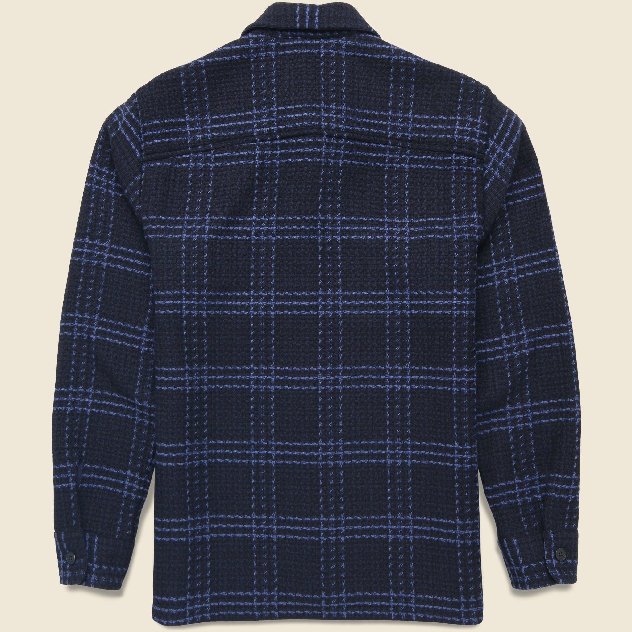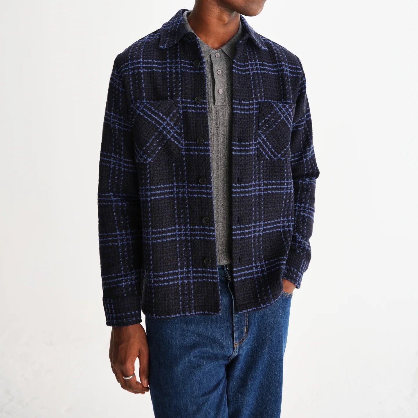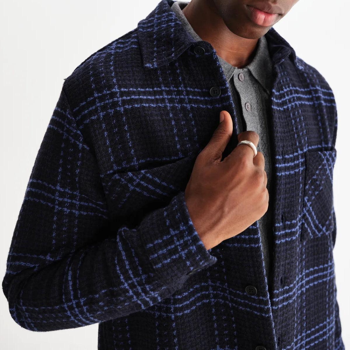 This Whiting Overshirt from Wax London is designed with a complex, unique basket weave fabric that was sustainably made by a family-run French mill using recycled cotton to make it a sustainable, reliable layer in your winter wardrobe. It has a relaxed fit that runs true to size and comes with two front patch pockets, contrast trim at the cuffs and neckline for added durability, and corozo nut buttons for a classic finish. Soft, heavyweight cotton-blend Complex, intricately woven basket weave pattern Two patch chest pockets Corozo nut buttons Spread collar Straight hem Relaxed fit that runs true to size We recommend taking your normal size Materials: 80% recycled cotton, 18% polyester, 2% other fibers The following measurements are for size Medium: Chest: 44” | Shoulder: 17” | Sleeve: 33 ½” | Length: 30”
