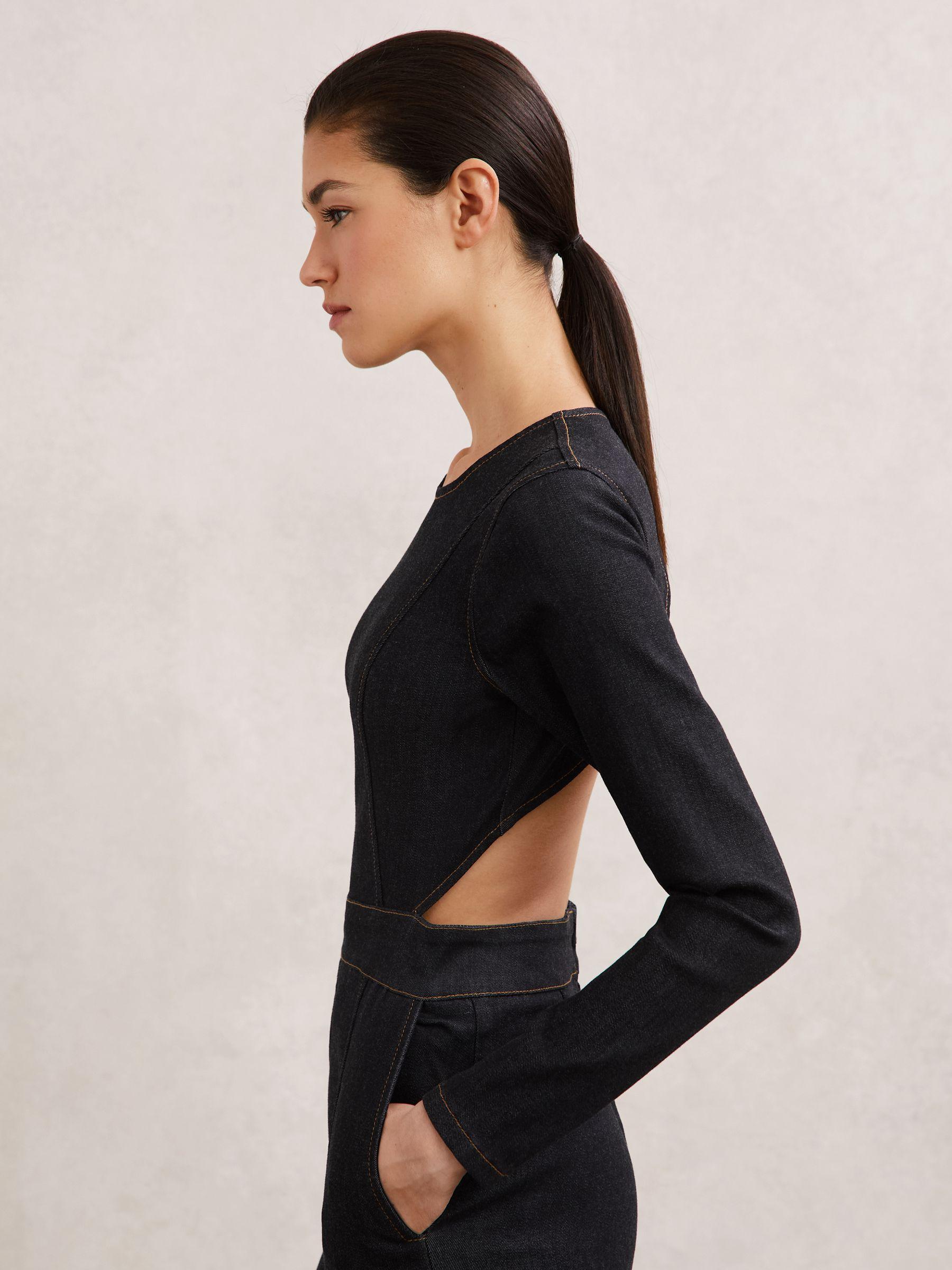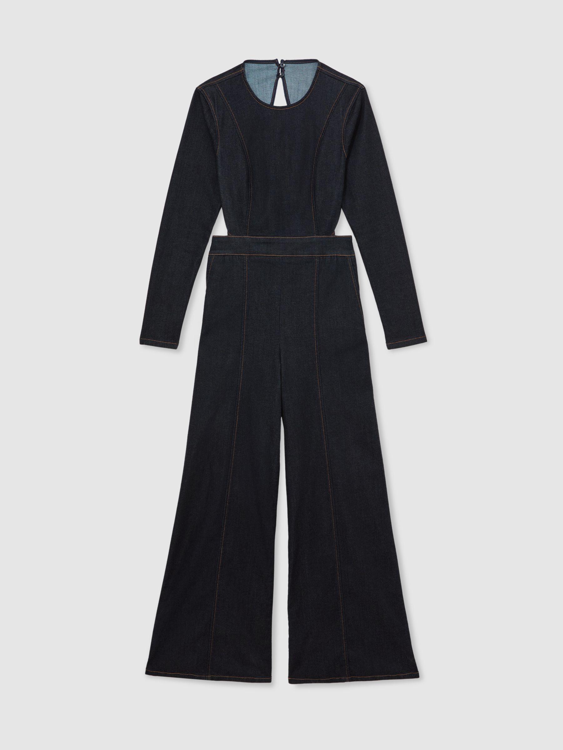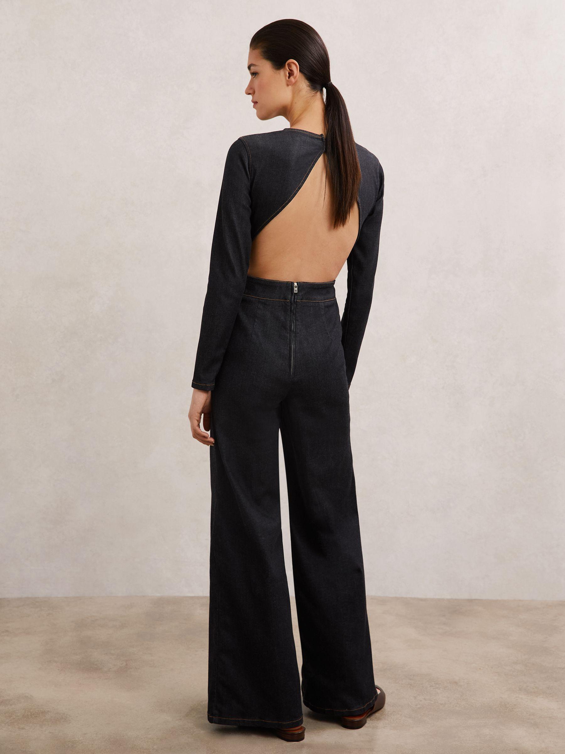 Wide-Leg Open-Back Denim Jumpsuit in Indigo Blue