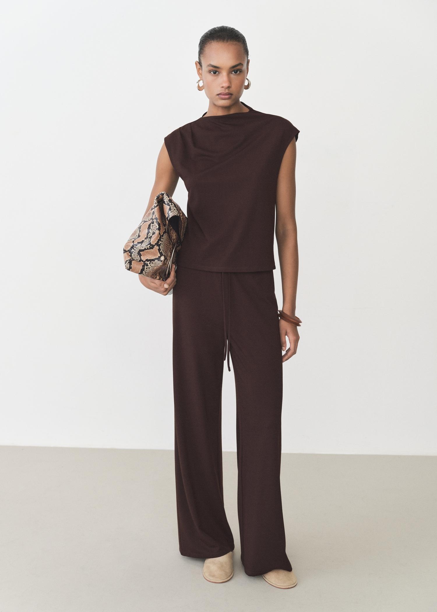 Fluid fabric. Wide-leg design. High waist. Elastic waistband. Adjustable loop closure. Total look. Inside leg measurement 30.59 in. Side length 43.07 in