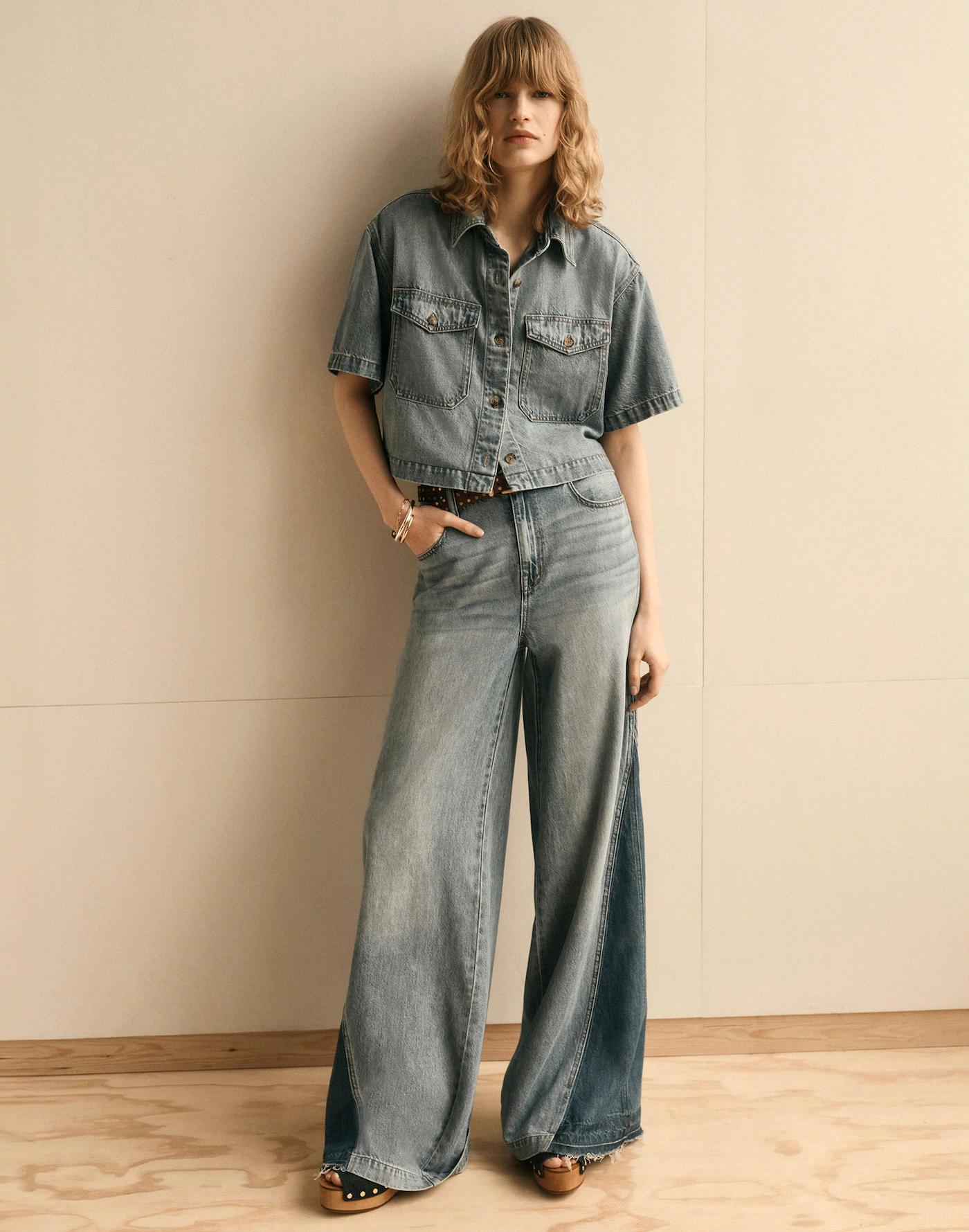 The cut: designed to be slung low, these drapey 70s-inspired jeans are relaxed through the hip and thigh with a sweeping wide leg. Plus, they feature contrasting side panels, an elongated inseam and slant front pockets.