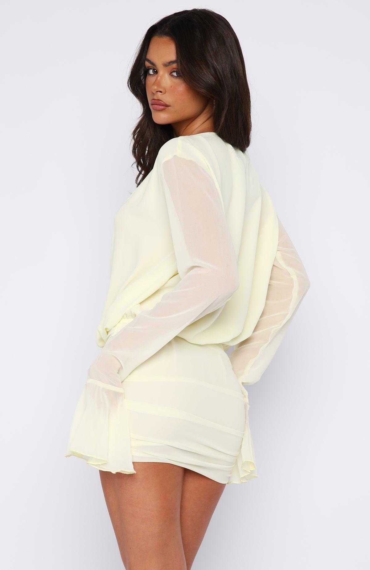 A summer spent well in the Wild Encore Long Sleeve Mini Dress Lemon. Features a daring plunge V-neckline, sheer long sleeves with ruffle cuffs, and a flowing bodice that cinches at the waist before falling into a figure-hugging skirt with stylish side ruching. Fully lined for comfort, it’s finished with a discreet invisible side zipper. Style with kitten heels for a look that transitions beautifully from daytime events to summer nights out.