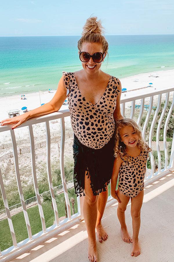 Take a walk on the wide side in this adorable iced mocha colored one piece swimsuit featuring lightweight four-way stretch material patterned with a black leopard print, a wrapped bodice with a side tie closure and a v-cut neckline, wide shoulder straps with subtle ruffled cap sleeves, a low scooped back, and a flattering figure hugging silhouette that ends in cheeky fit bottoms! This swimsuit comes with removable padding. Measurements S : Hip 34-38", Int Cup A-C", Length 26.5", Waist 24-28". M : Hip 36-40", Int Cup A-C", Length 27", Waist 26-30". L : Hip 38-42", Int Cup B-D", Length 28", Waist 28-32".