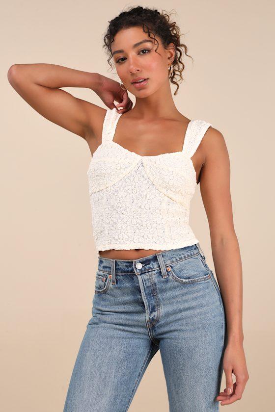 You can keep things sweet and simple all season long with this jacquard stretch-knit top, featuring a sleeveless design with tapered shoulder straps and a subtle sweetheart neckline. Seamed cups accent the fitted bodice that finishes at a cropped hem.