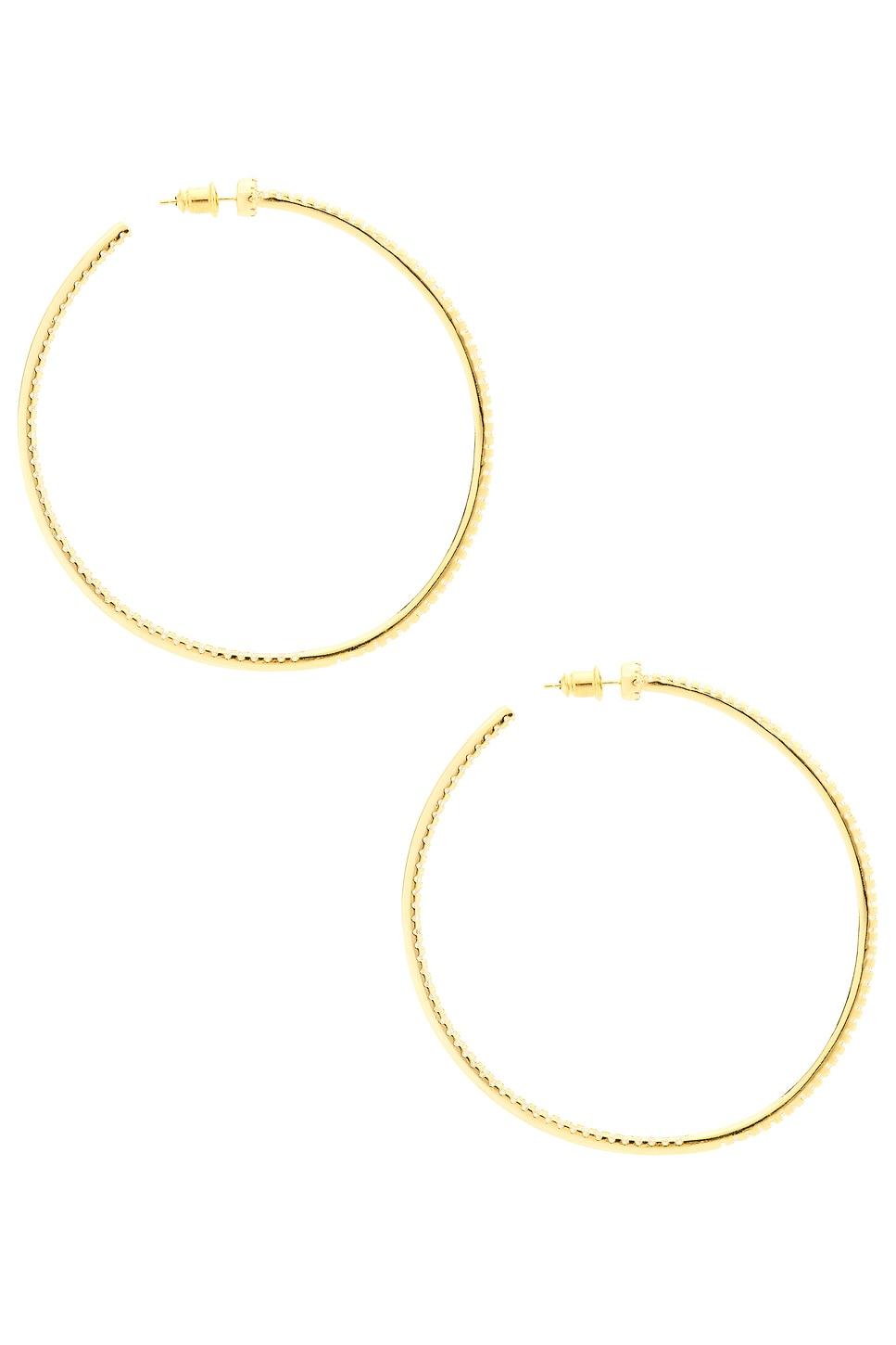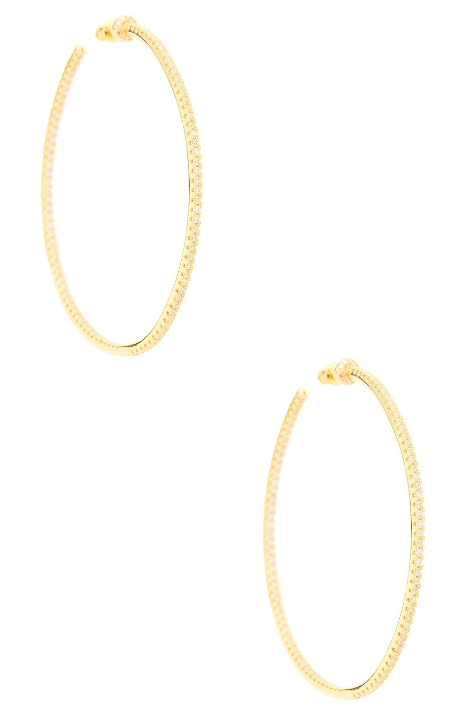 Gold-tone metal earrings with cubic zirconia stones. Post-back closure. Measures approx 2.5" in diameter. Made in US. Revolve Style No. BCHA-WL251. Manufacturer Style No. E-47.