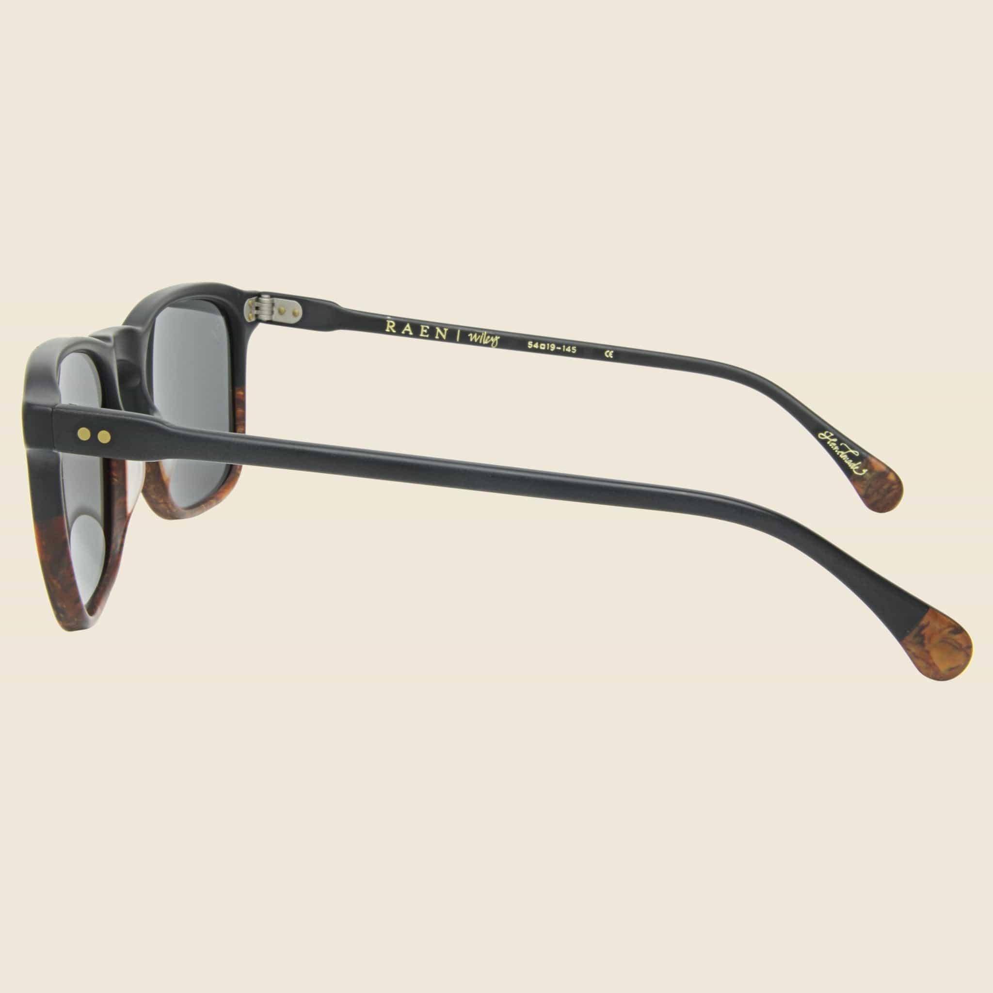 A lightweight, masculine silhouette for the modern adventurer. The Wiley utilizes square shapes and harder lines made for seeing the sunrise on new horizons. Temples handmade from zyl acetate Five barrel hinges Wire core embedded in each temple for strength Polarized lenses 100% UVA/UVB protection Best on square, medium to large faces Measurements: Bridge Width: 19mm | Eye Width: 54mm | Eye Height: 43mm | Temple Arm Length: 145mm